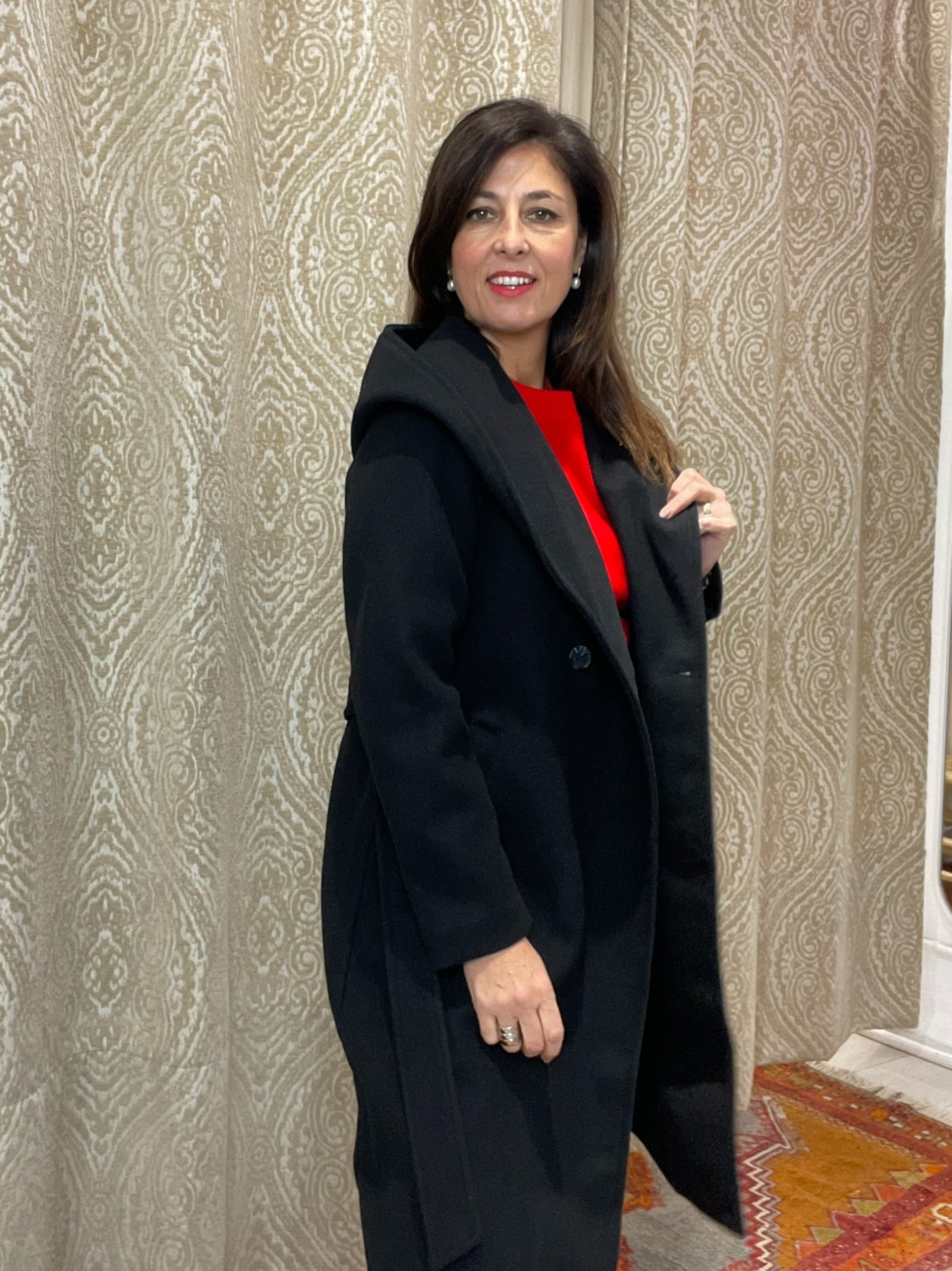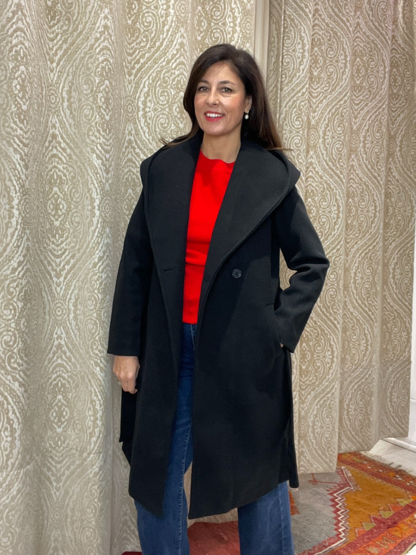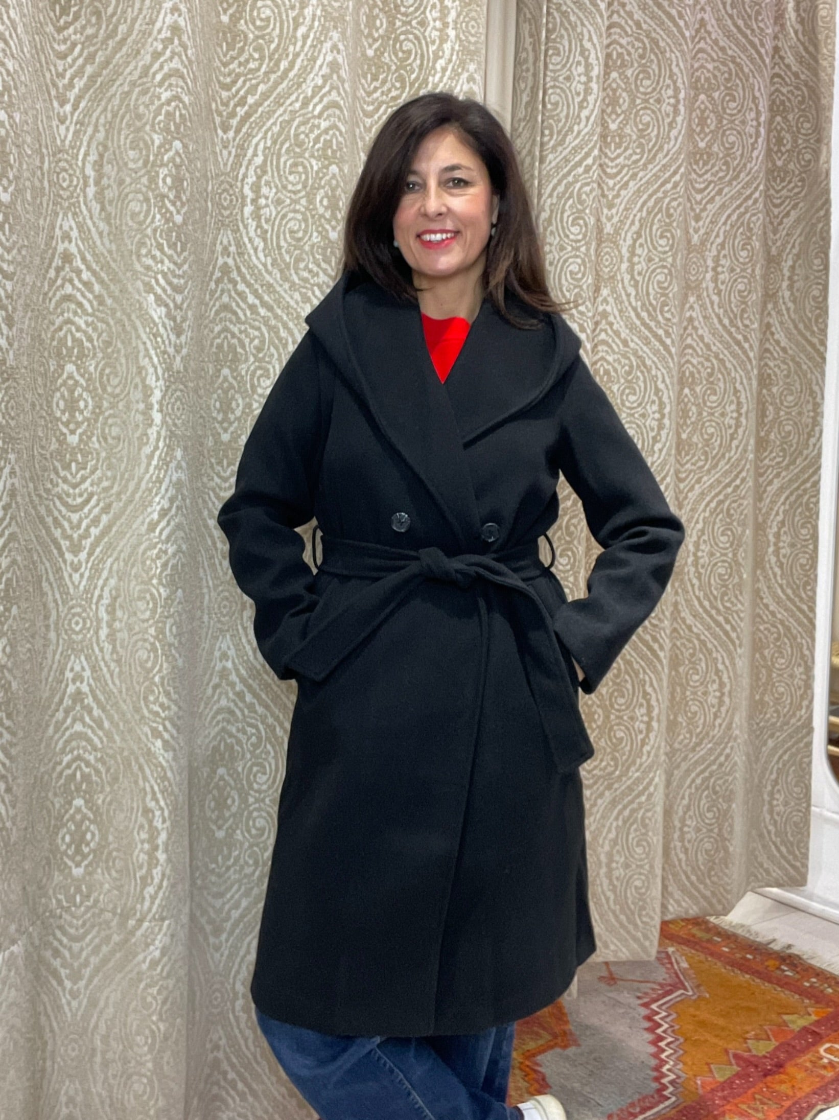 -Abrigo de paño fino color negro, con cierre de botones cruzados, bolsillos laterales y cinturón.