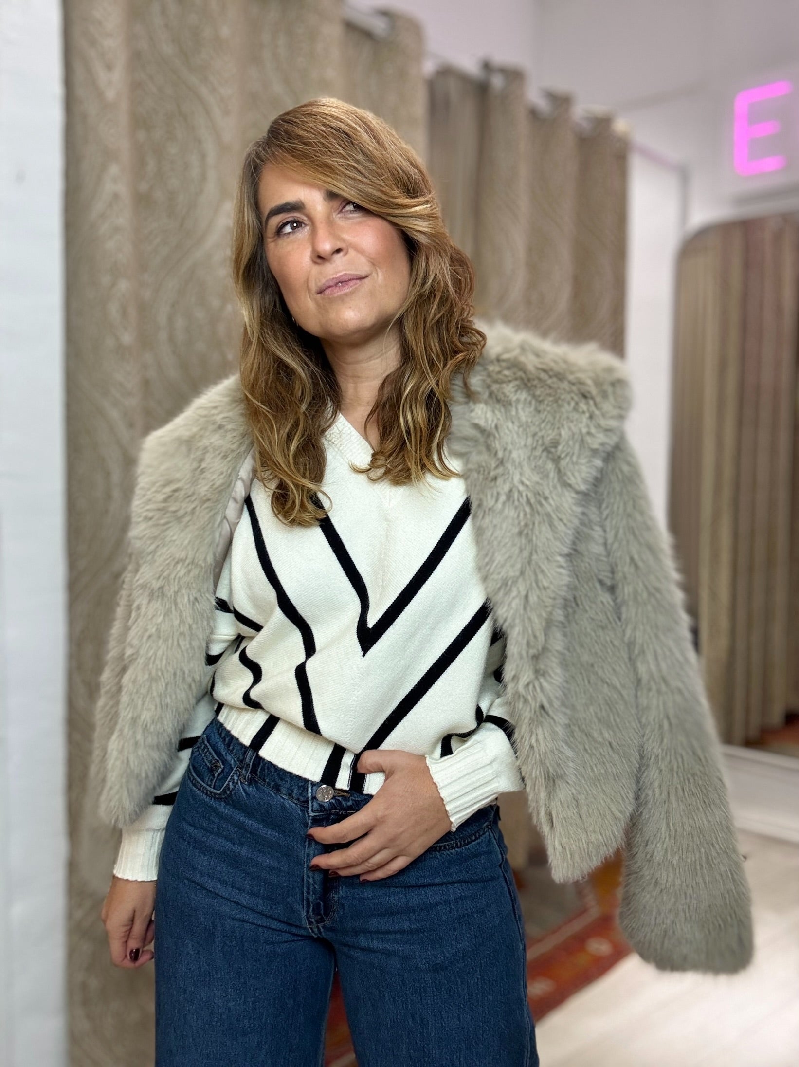 -Abriguito corto en pelo largo beige, cuello solapas, cierre de botón delantero y bolsillos.