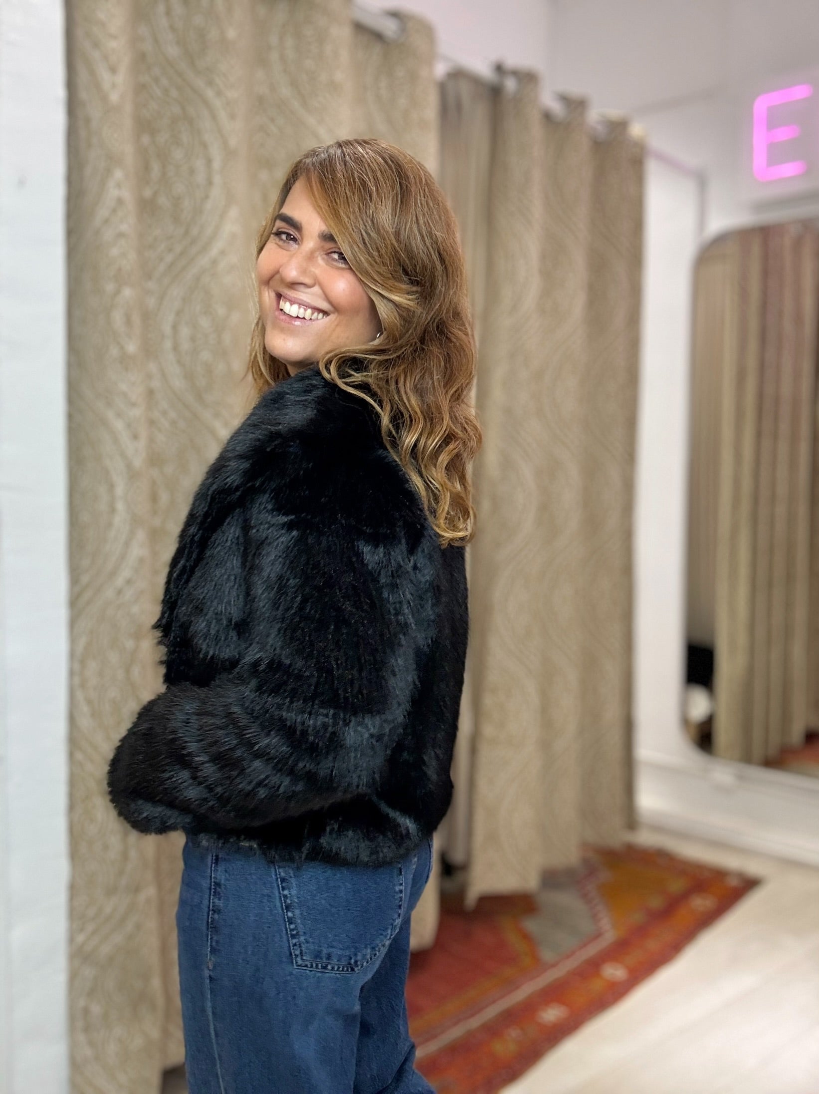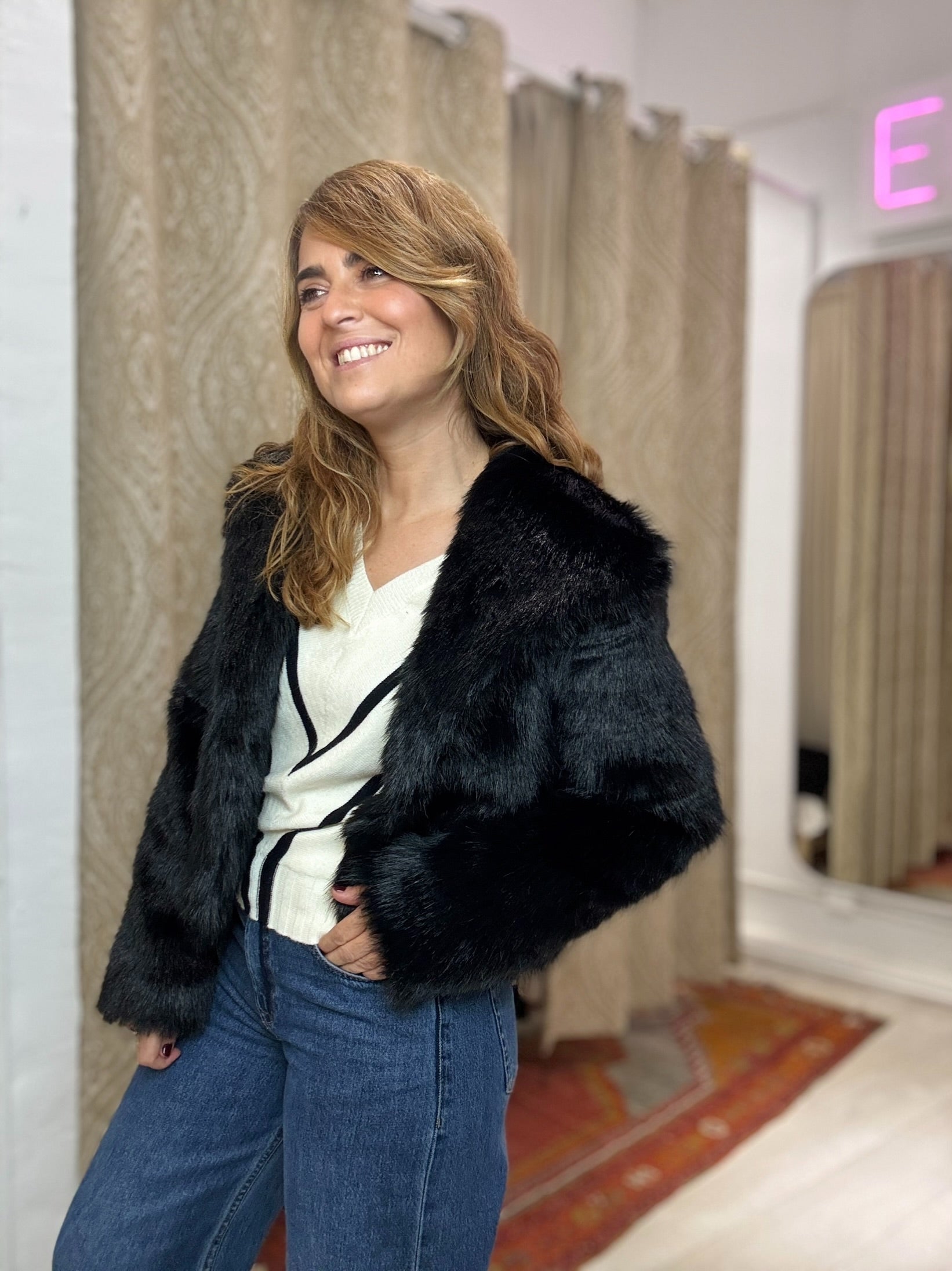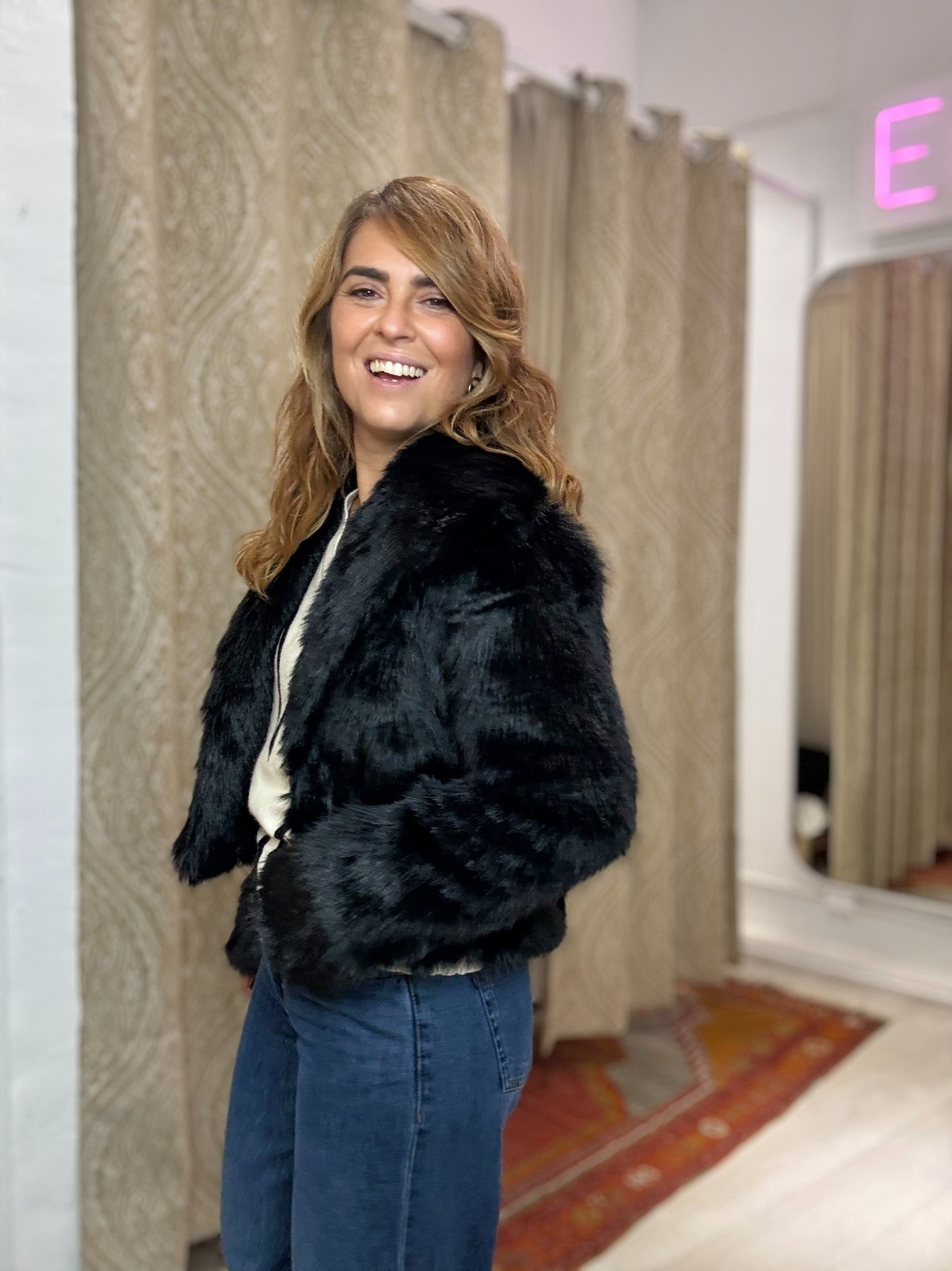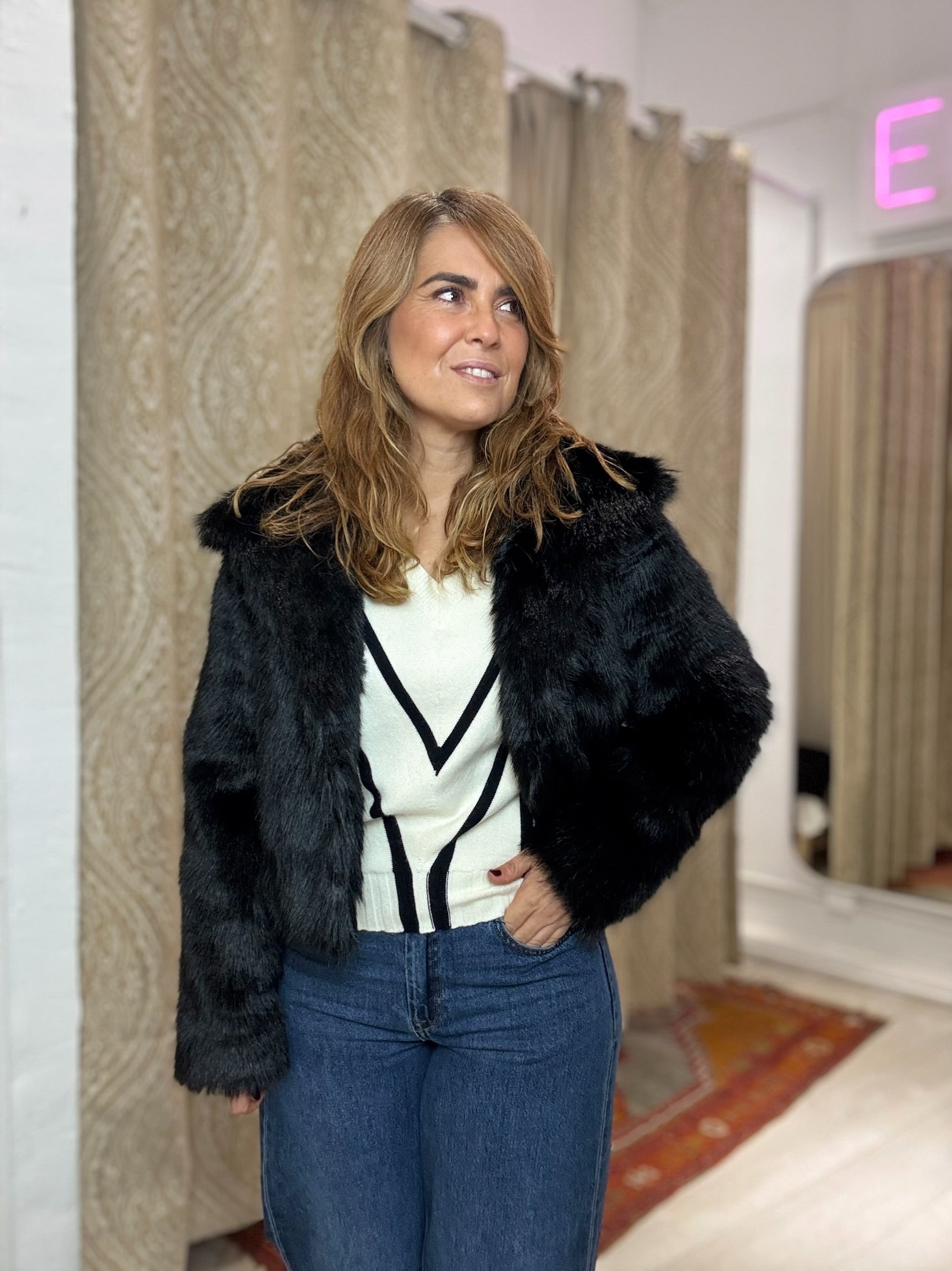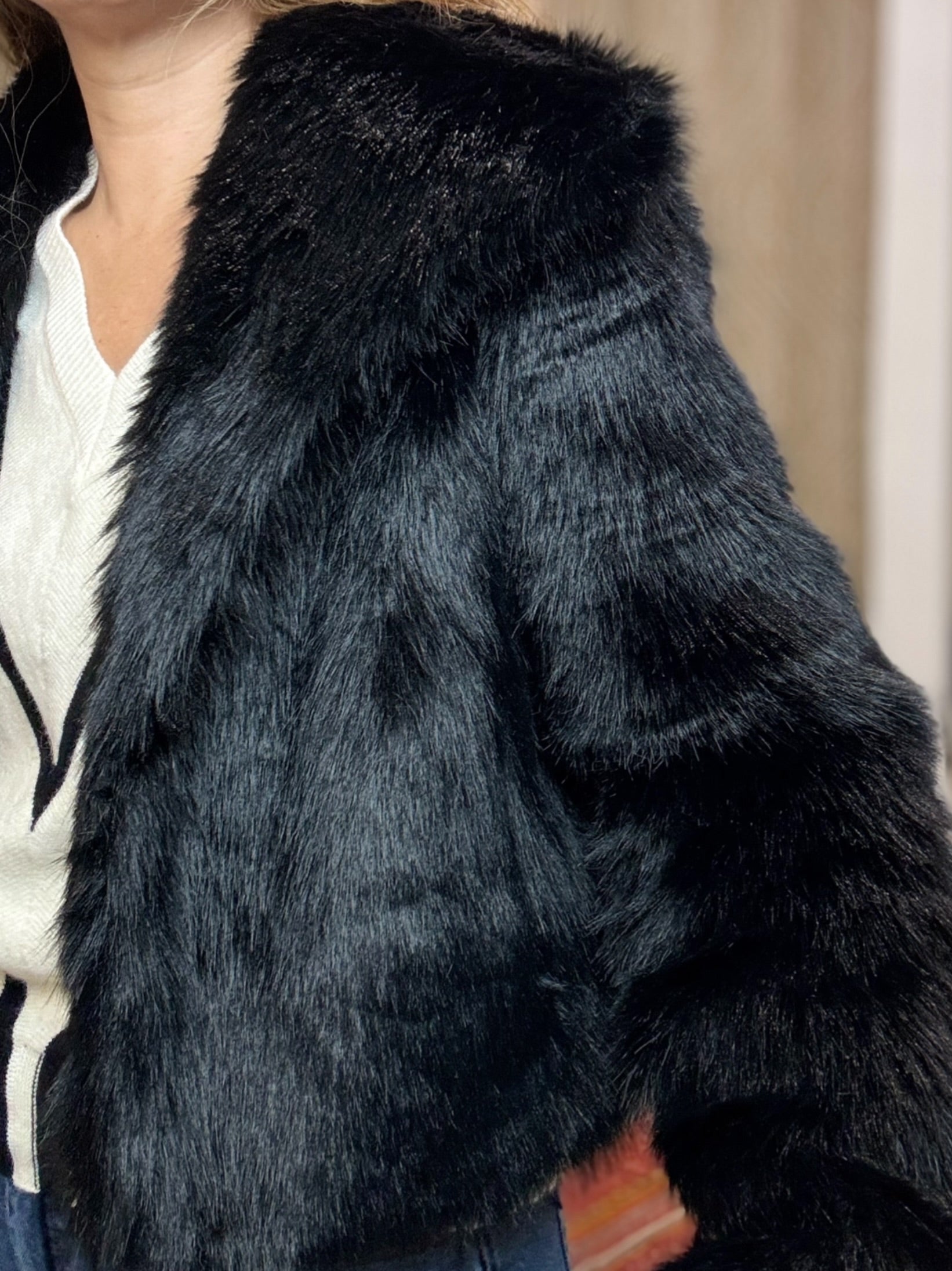 -Abriguito corto en pelo largo negro, cuello solapas, cierre de botón delantero y bolsillos.