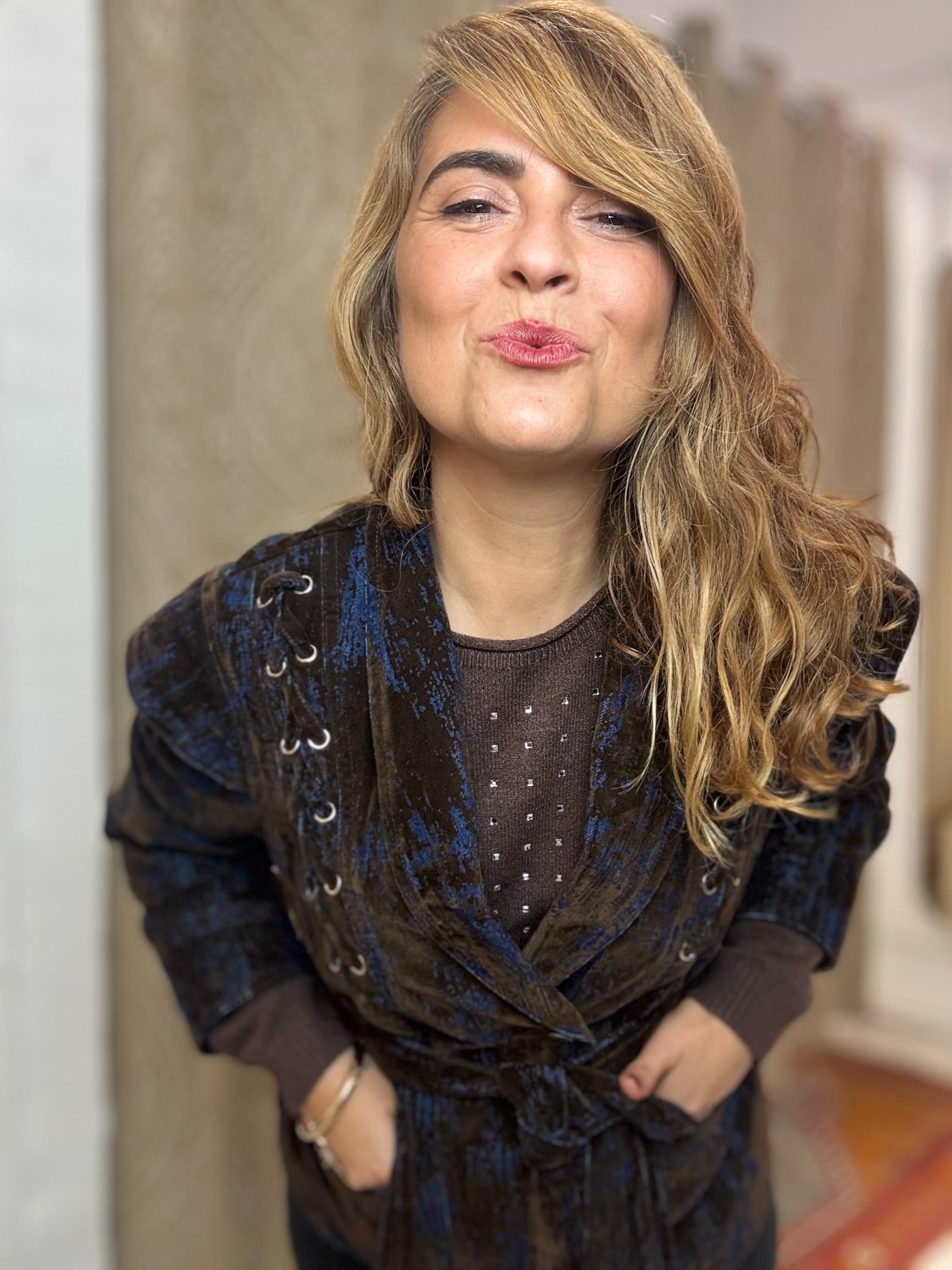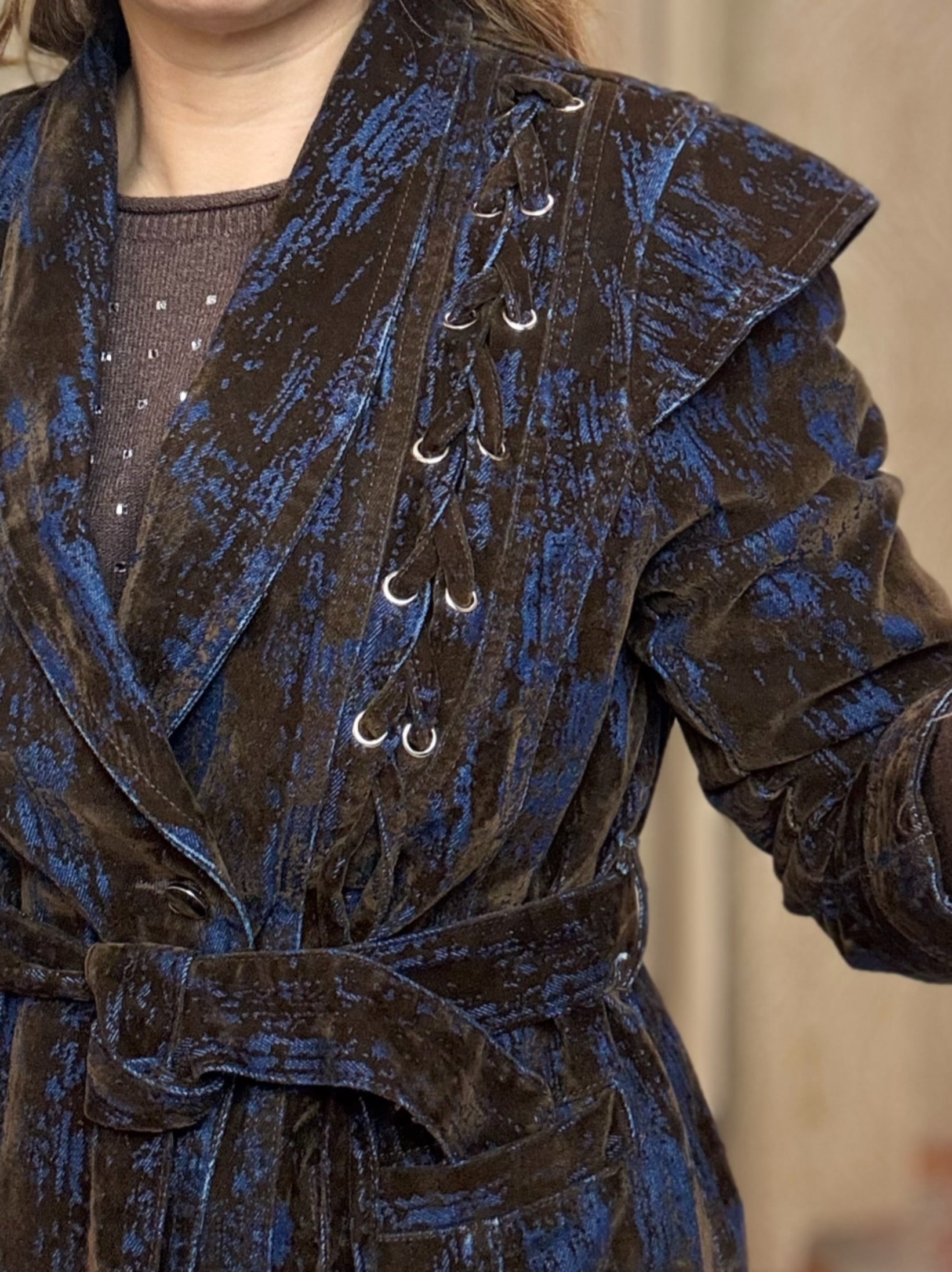 -Detalle de los dos tejidos, vaquero y aterciopelado chocolate, en toda la prenda.
