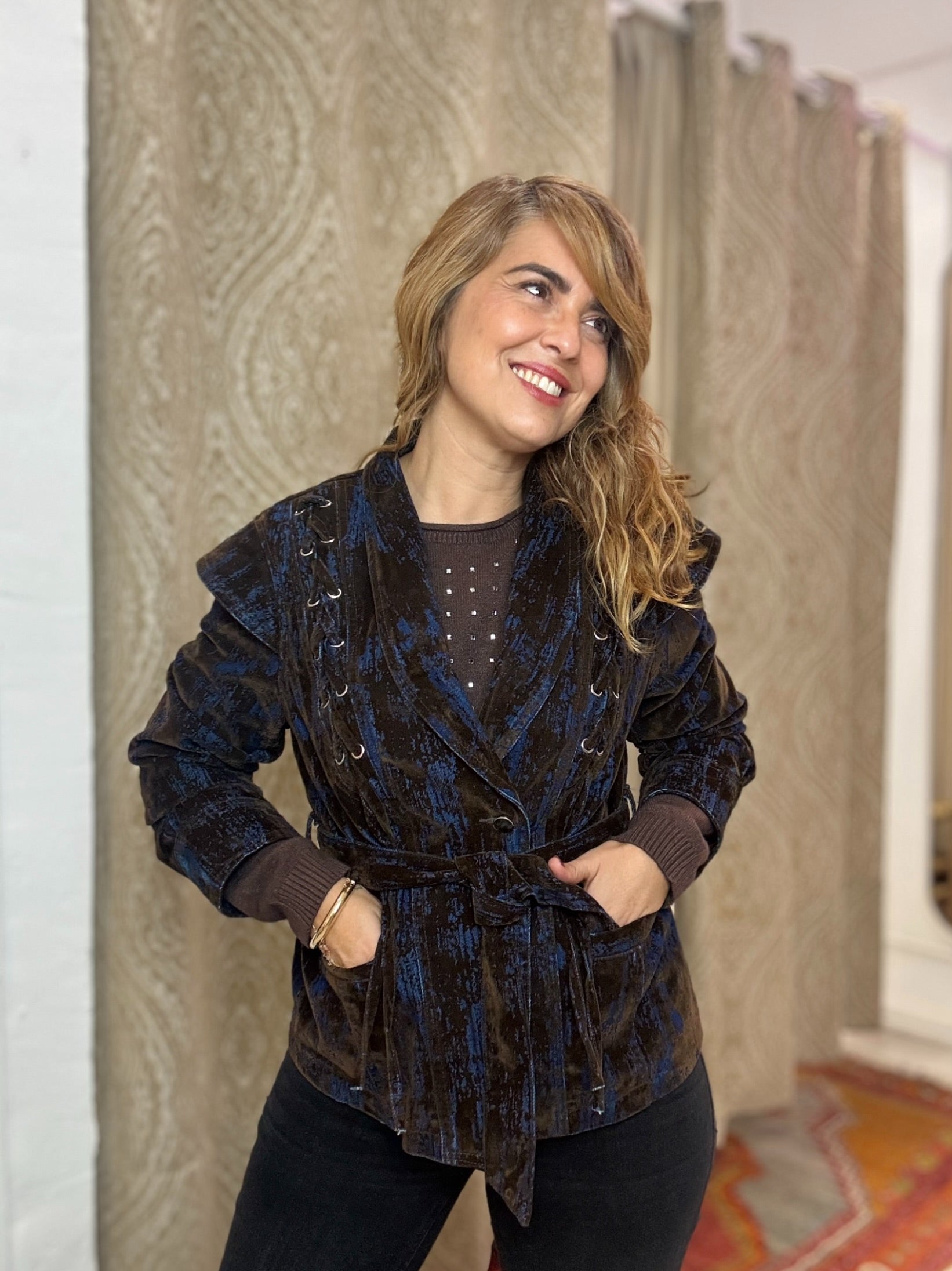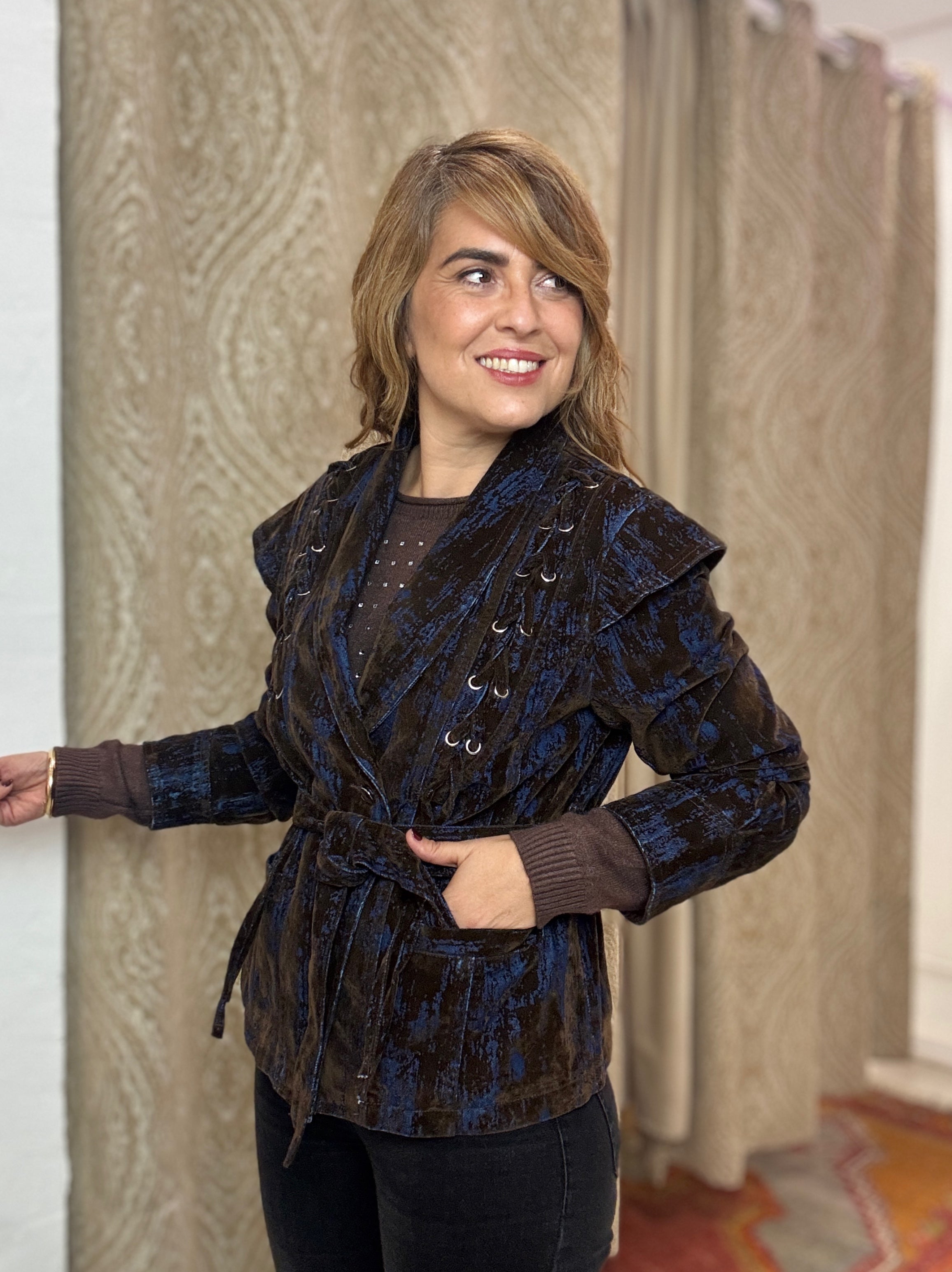 -Americana tipo cazadora en dos tejidos, cierre de un solo botón y cinturón y manga larga.