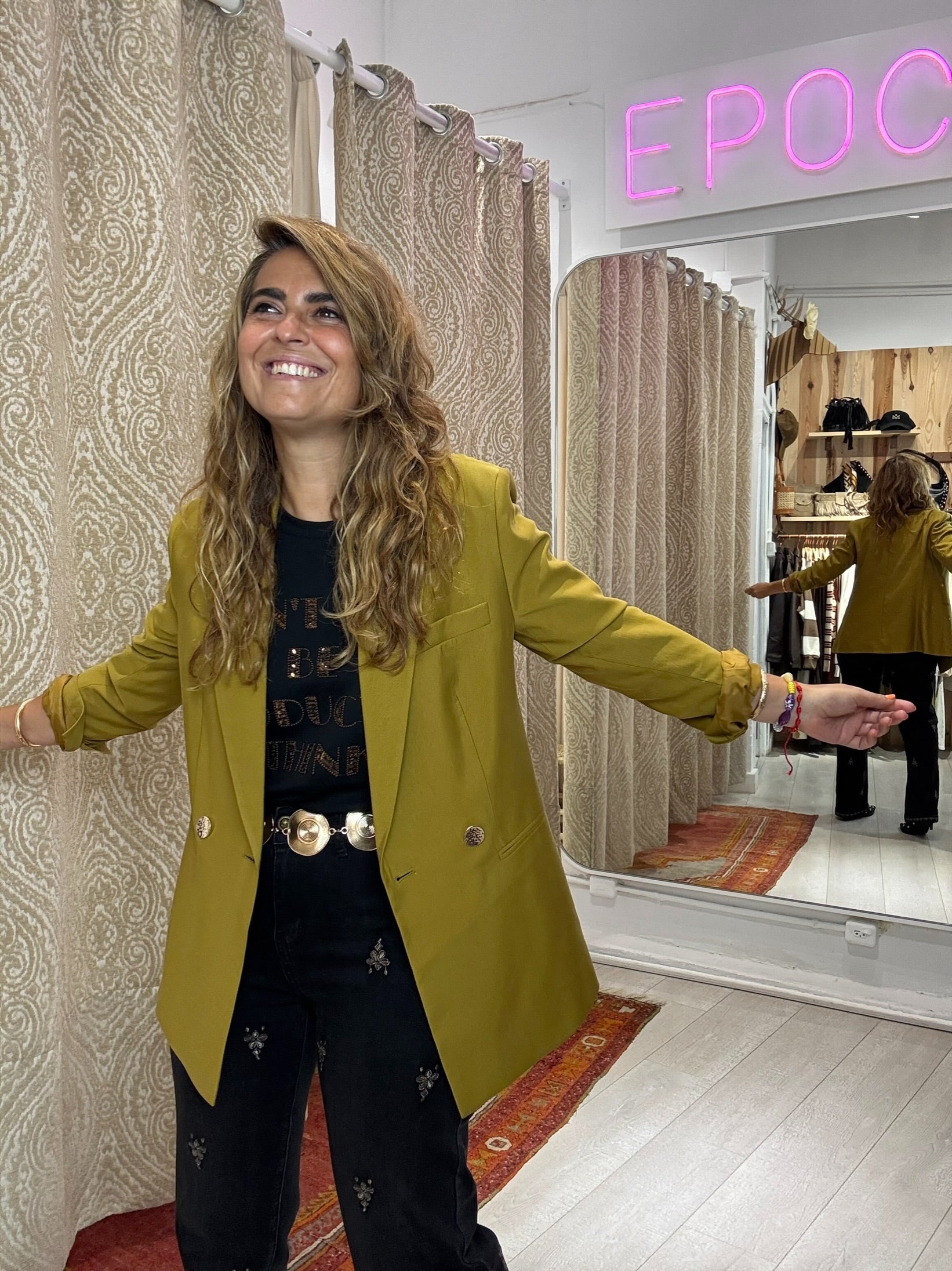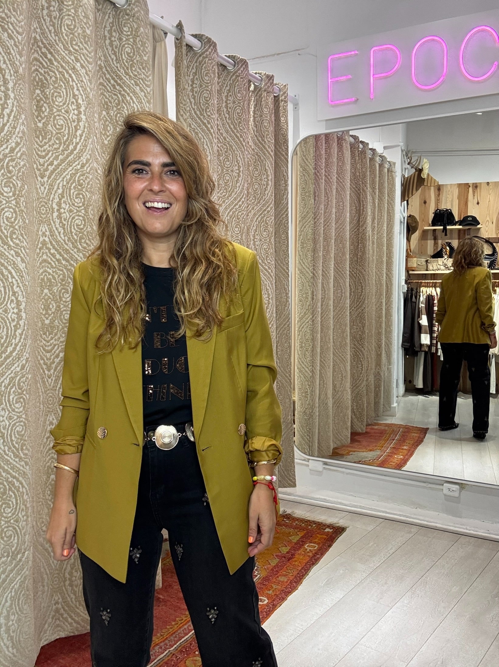 -Americana recta en color oliva, cuello solapas y bolsillos laterales.