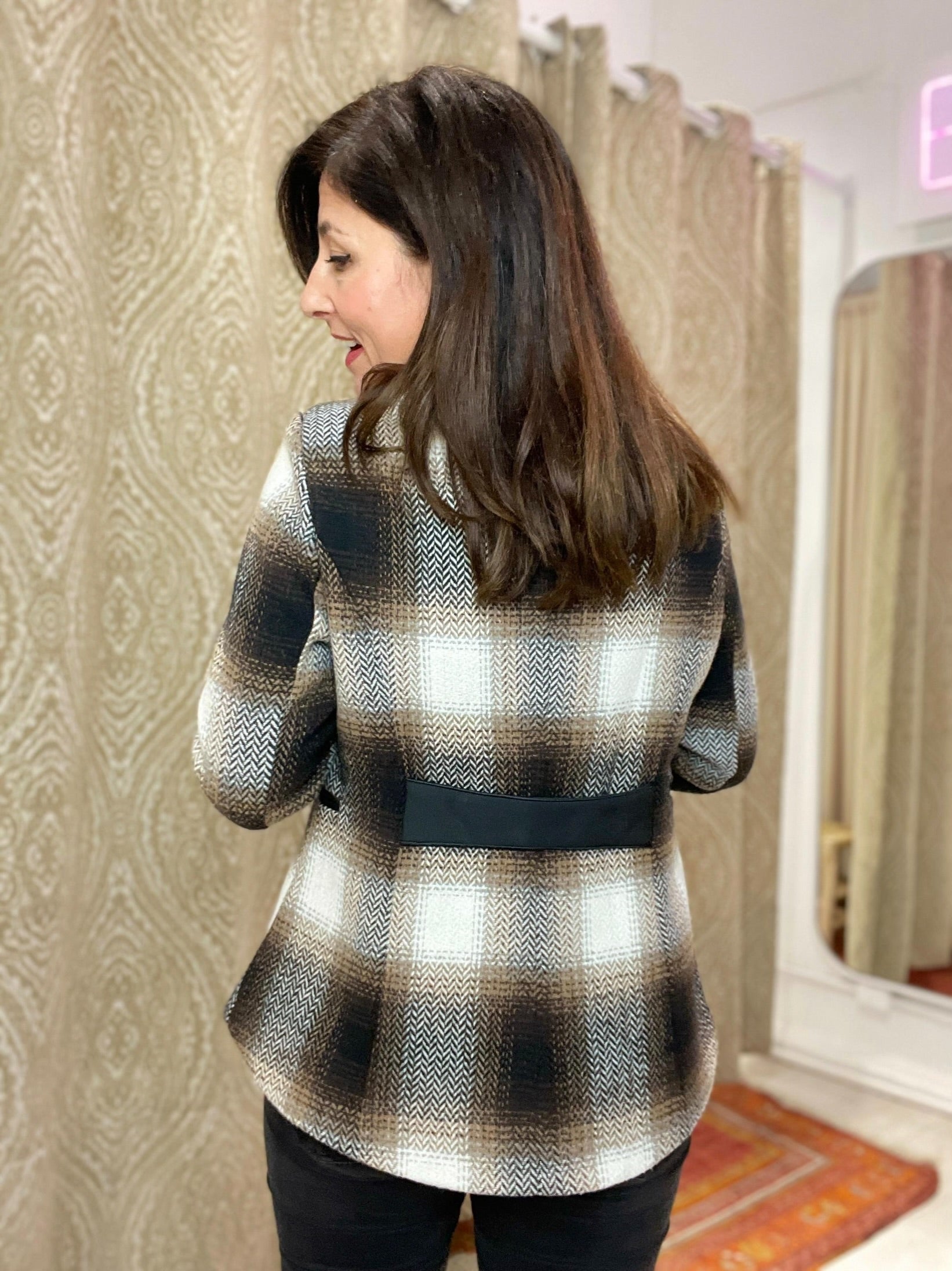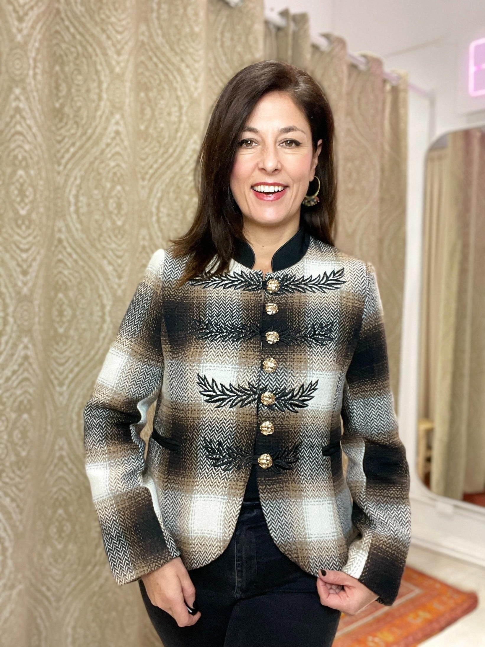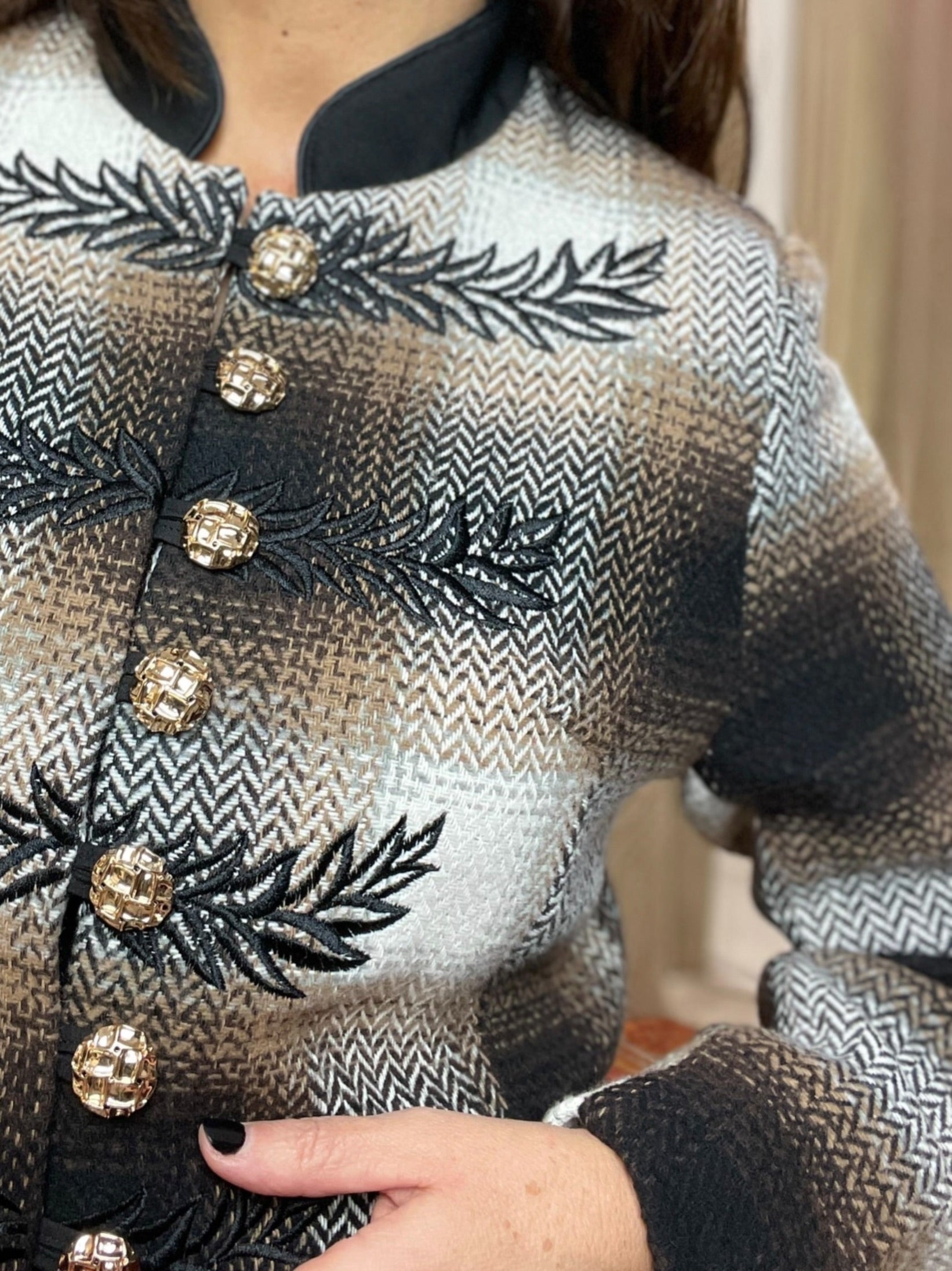 -Detalle del tejido en tweed de espiga con tonos marrones, blanco y negros y de hojas bordadas en el área de los botones .