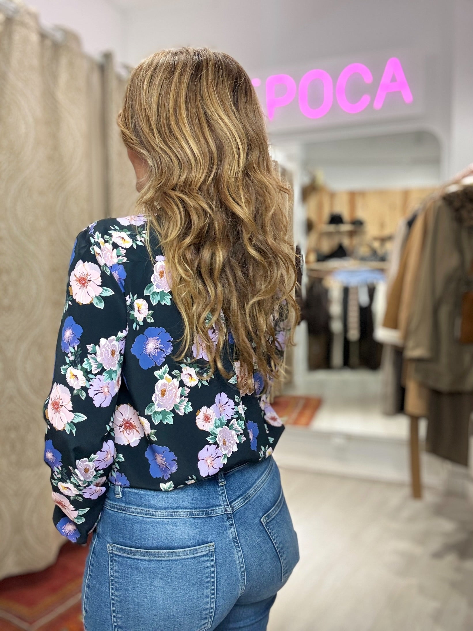 -Blusa en tejido fluido con cuerpo, escote en V, cierre botones y manga larga.