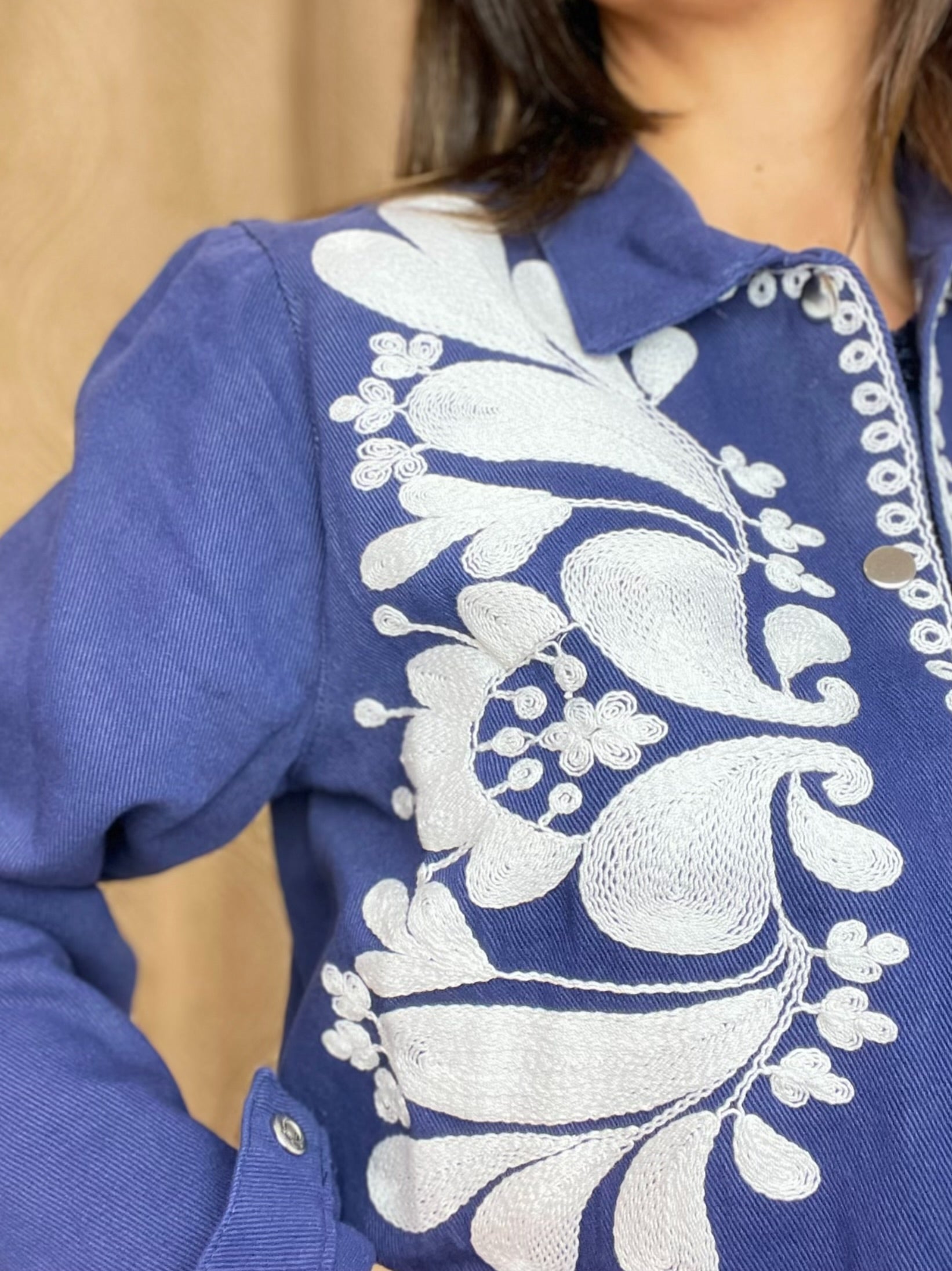 -Cazadora vaquera corta color azulón con manga larga y cierre de corchetes delanteros.