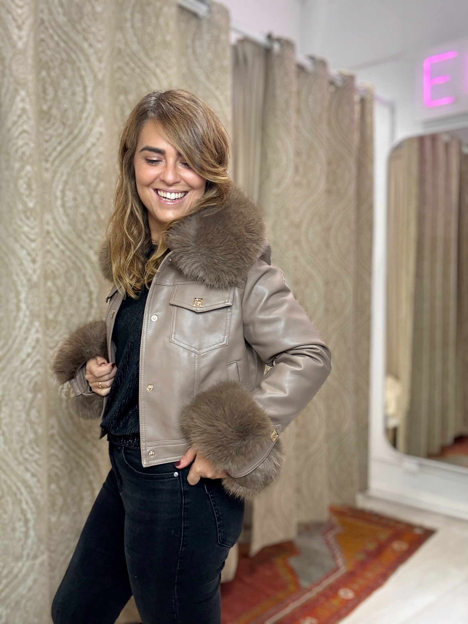 -Cazadora corta tipo biker en polipiel color beige con pelo beige en el interior, cuello solapas y cierre de botones dorados joya.