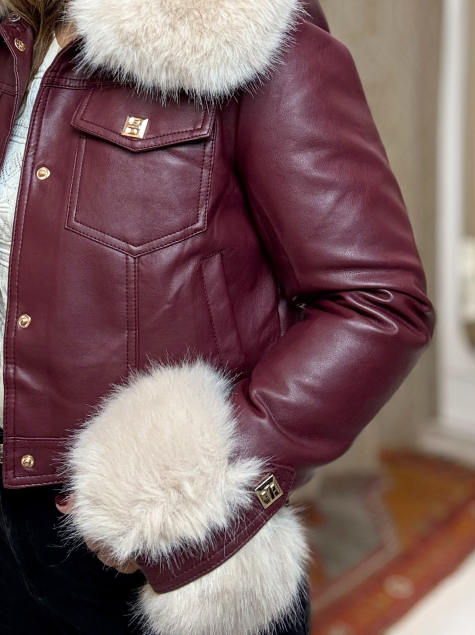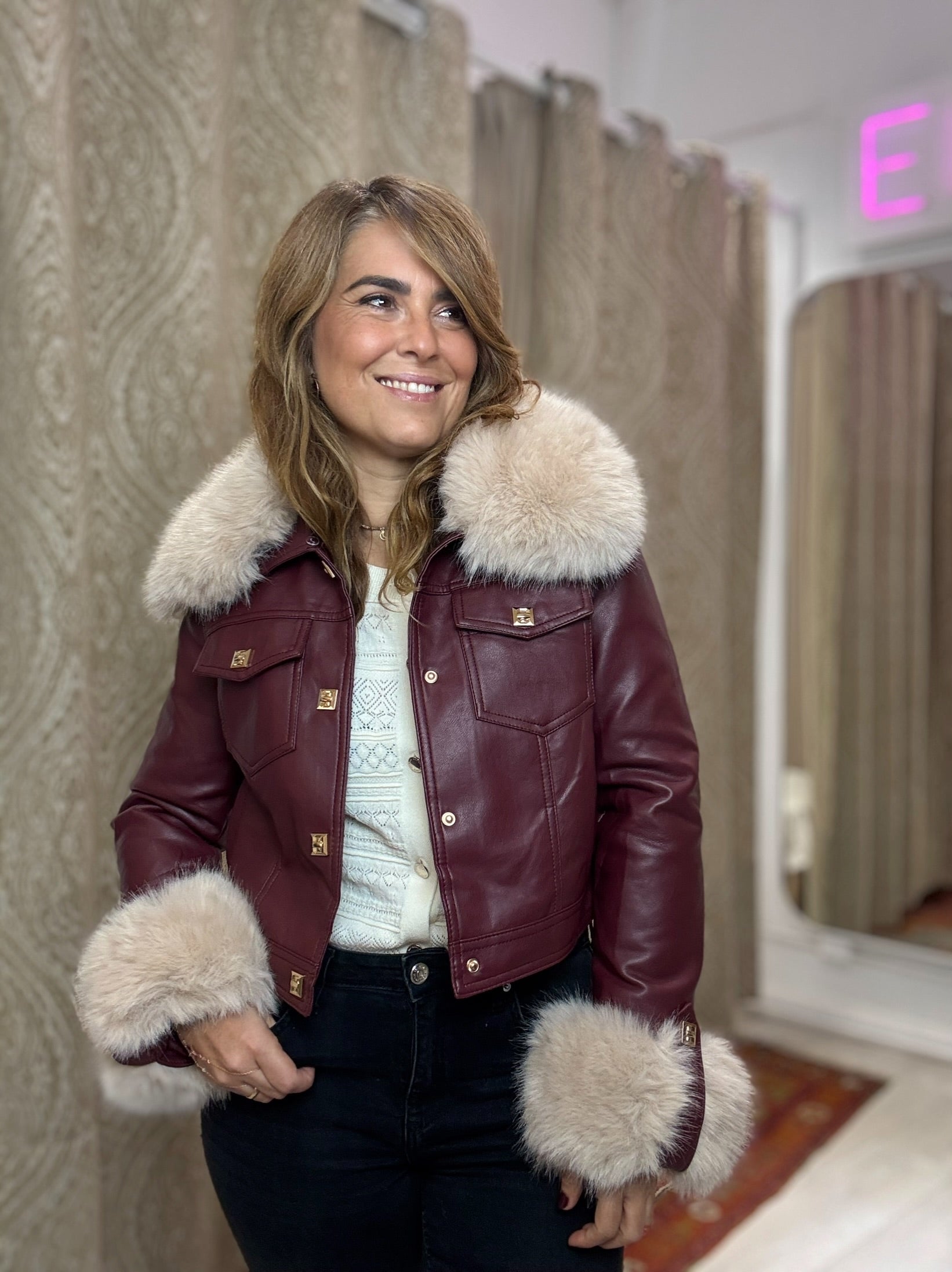 -Cazadora corta tipo biker en polipiel color granate con pelo crema en el interior, cuello solapas y cierre de botones dorados joya.