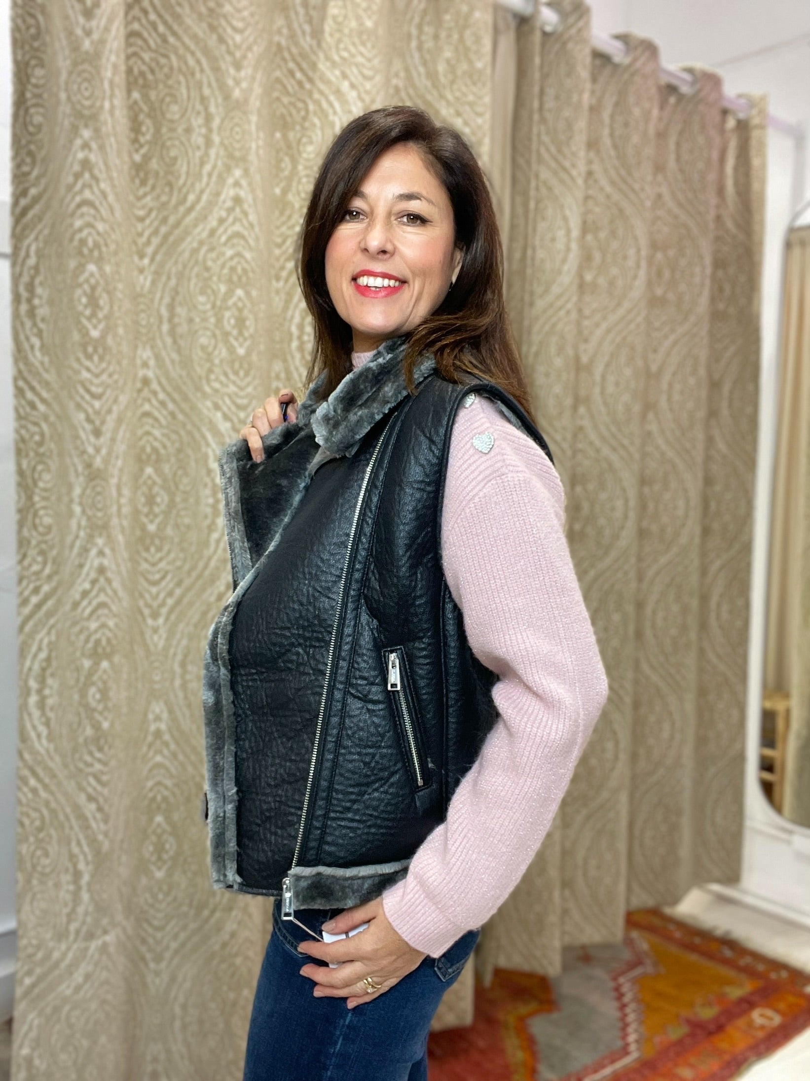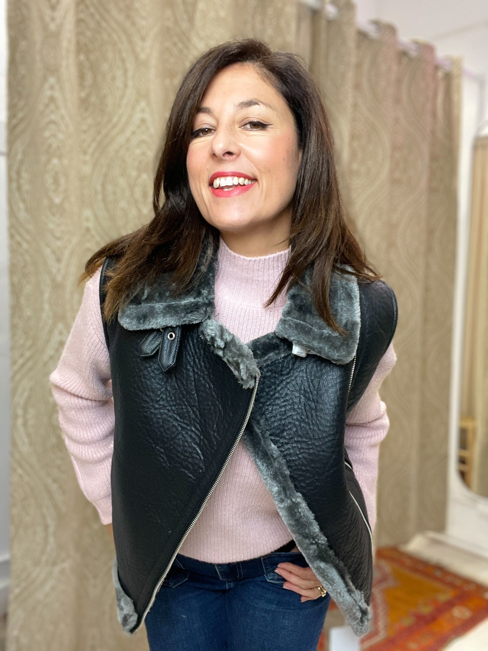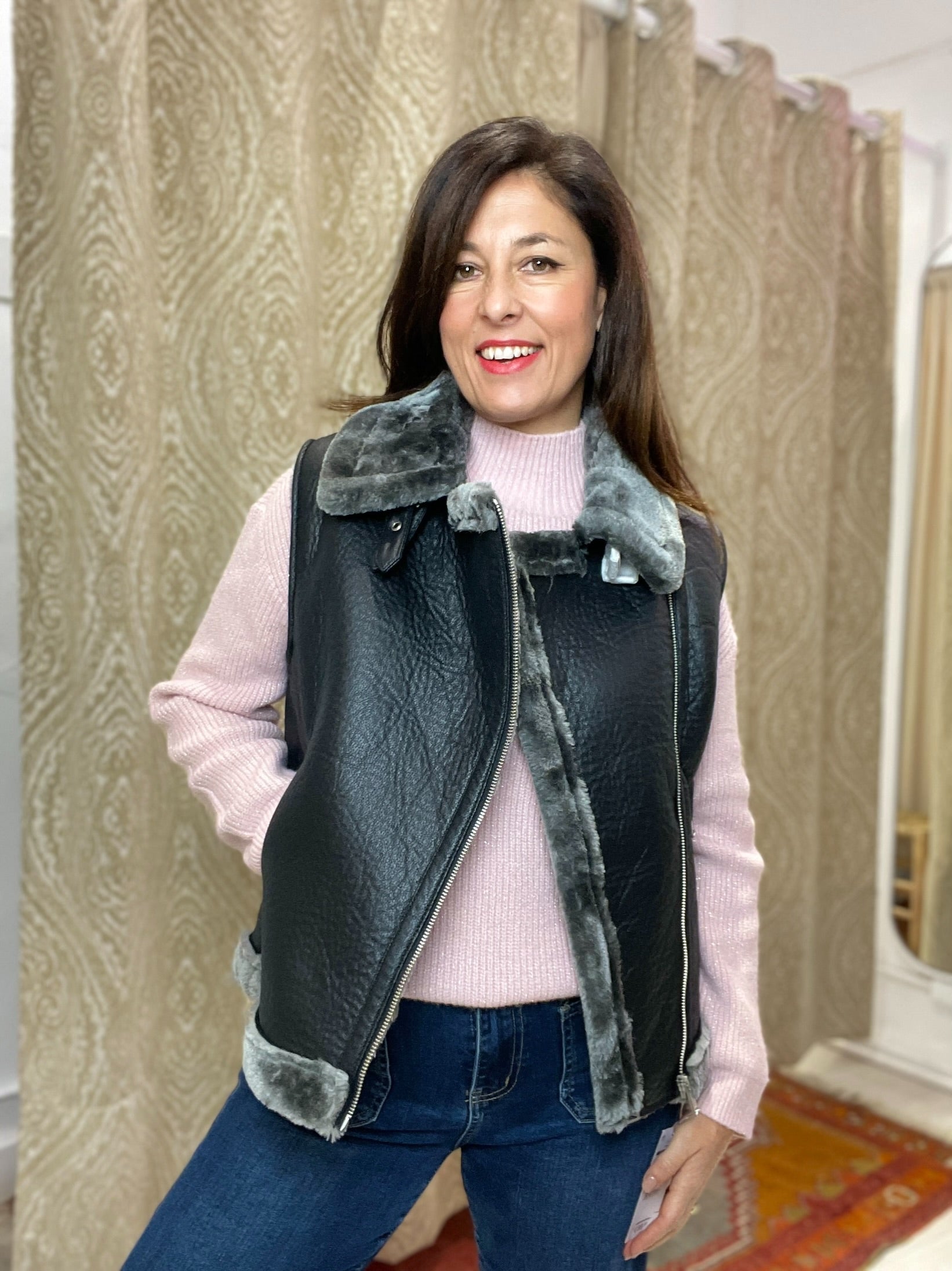 -Detalle de todo el forro de borreguito en color gris tornasolado al igual que todos los vivos del chaleco.