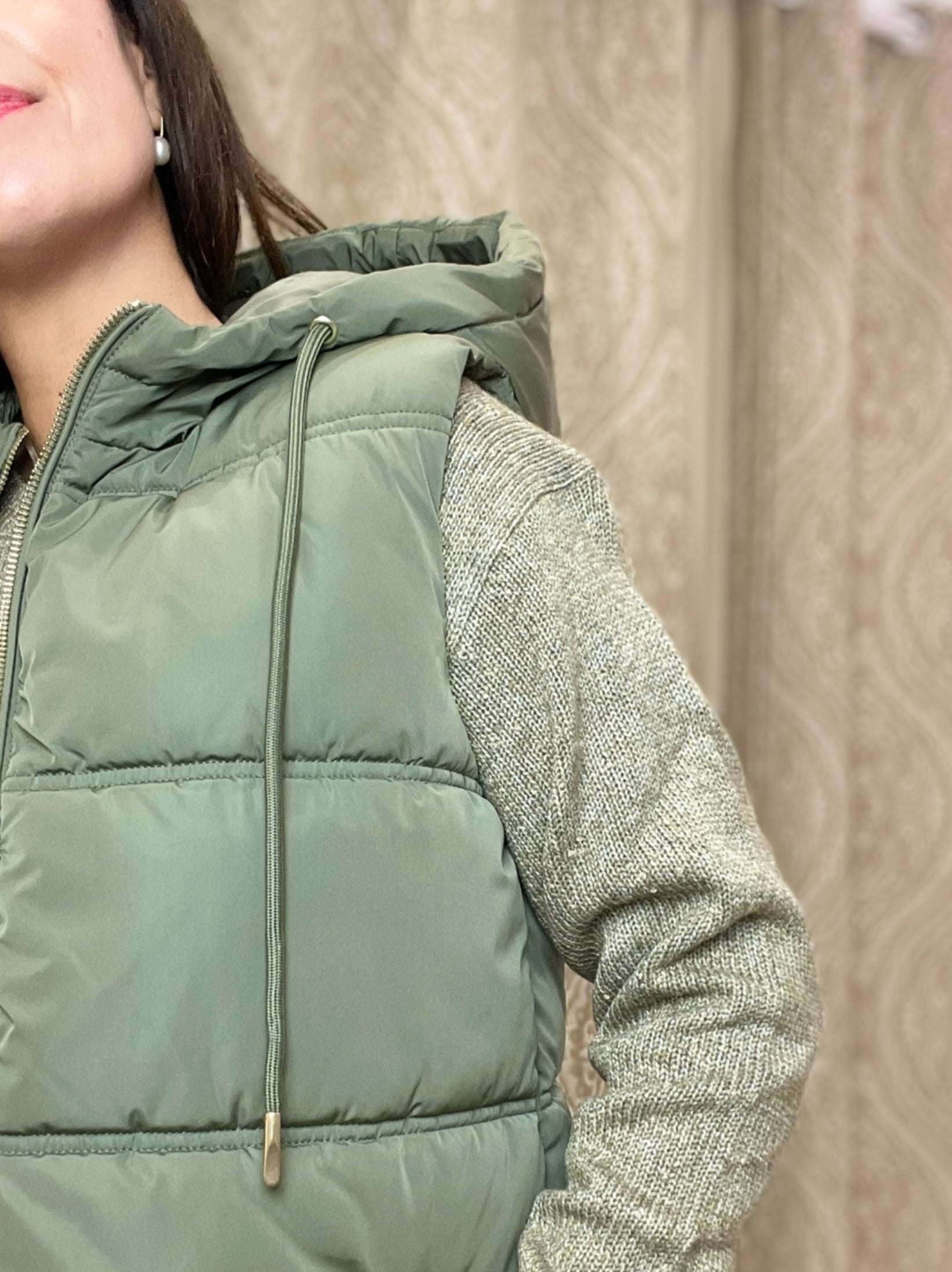 -Chaleco acolchado en color verde caqui de largura media, bolsillo laterales, capucha y cierre de cremallera delantera.