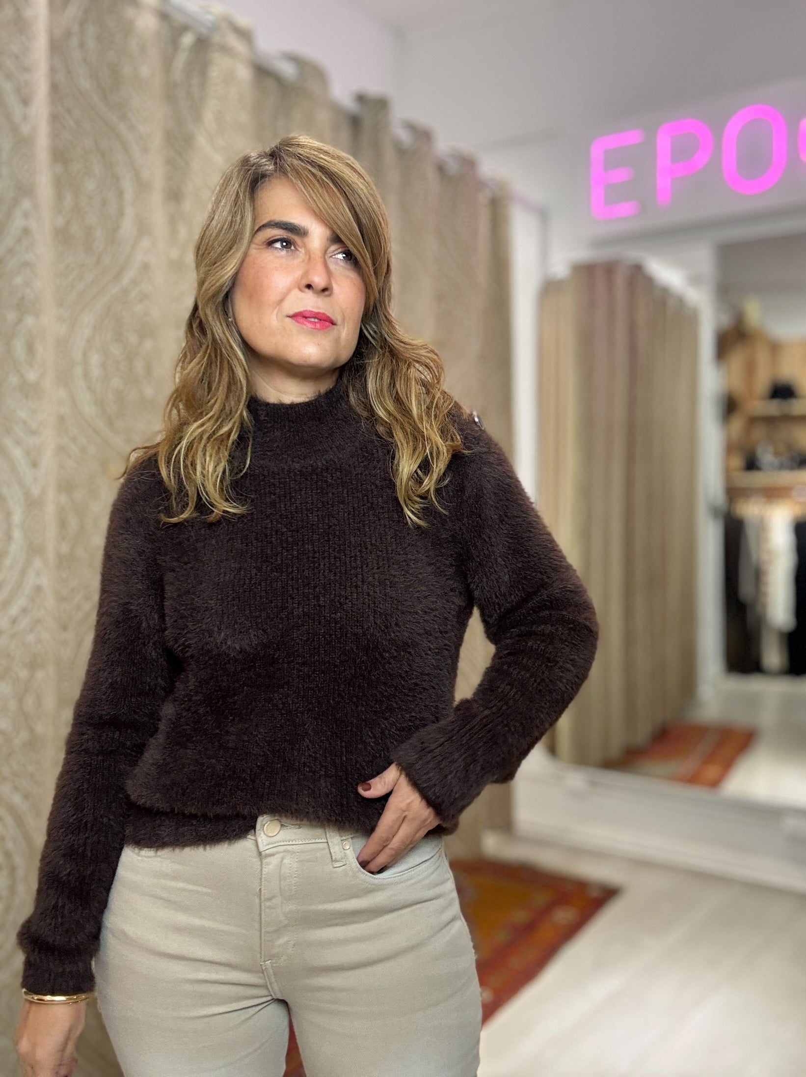 -Jersey en punto tipo peluche, cuello cisne y manga larga.