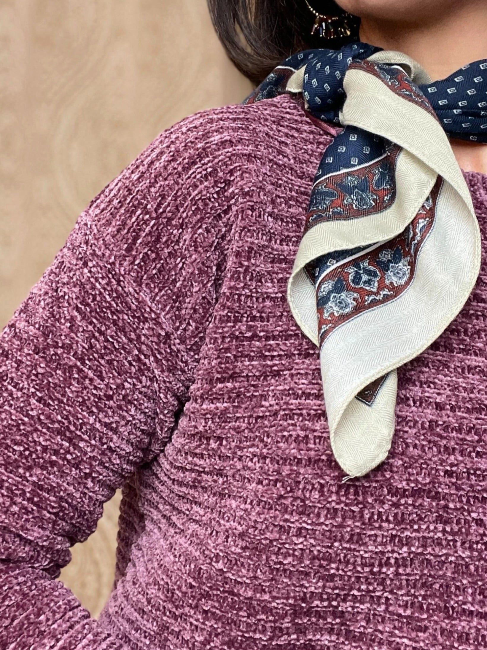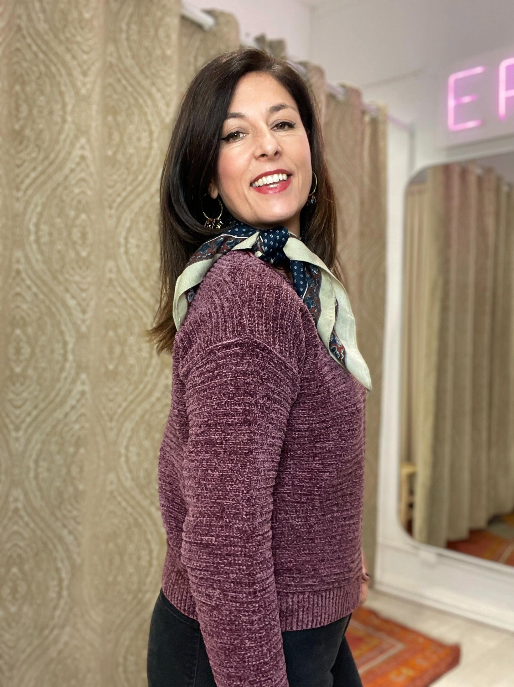-Jersey en punto medio morado, cuello redondo y manga larga.
