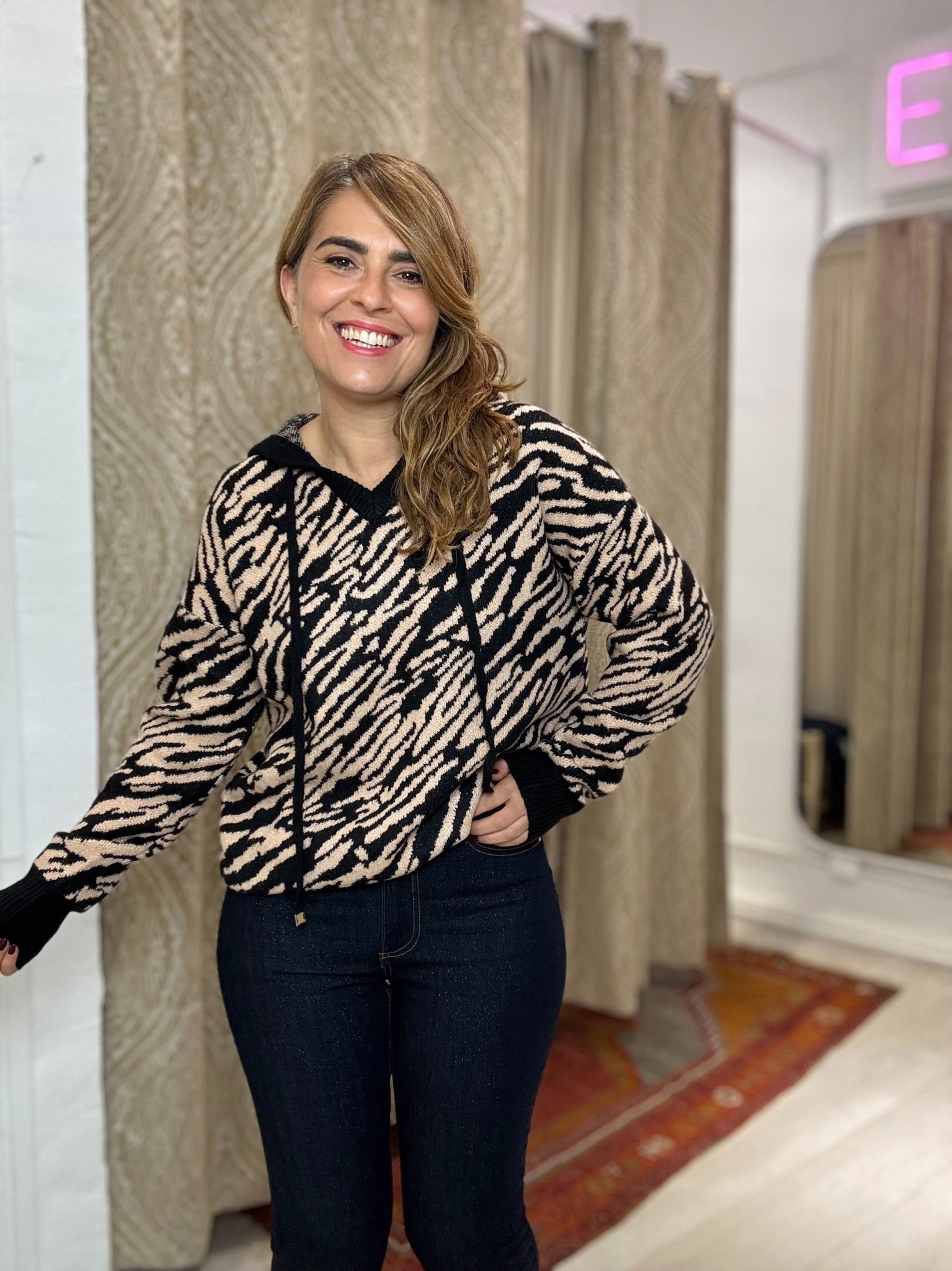 -Jersey tipo sudadera en punto con capucha, cuello en V y manga larga.