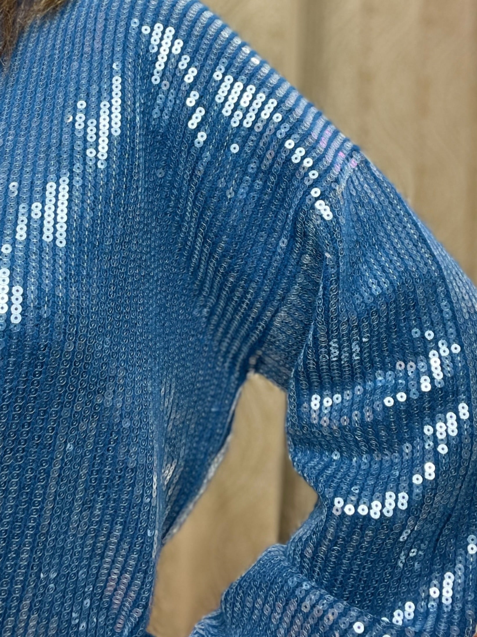-Detalle del tejido adornado casi totalmente con finas lentejuelas transparentes distribuidas en líneas verticales, a excepción del cuello, puños y cintura.