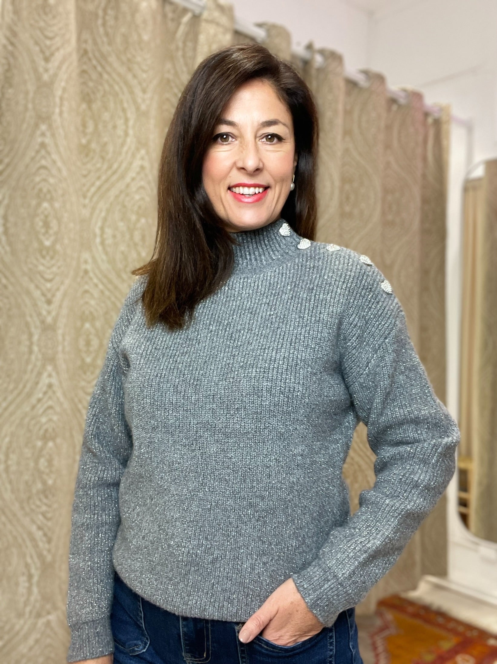 -Detalle del tejido con un brillo en plata y espectaculares botones desde el cuello hasta el hombro izquierdo, con forma de corazon y de brillantitos.