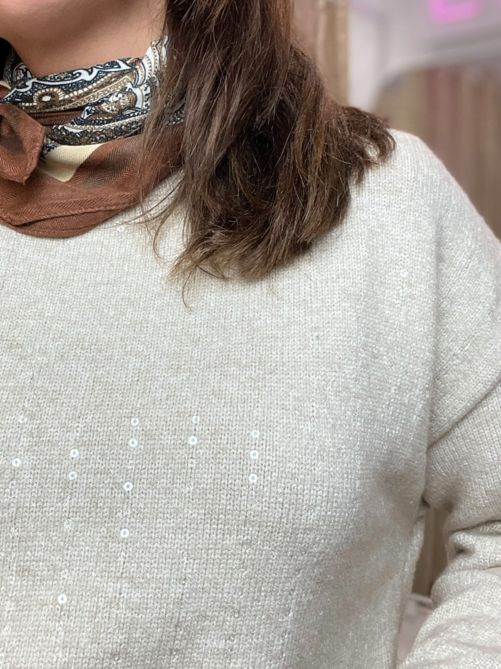 -Jersey en punto medio beige, cuello redondo y manga larga.