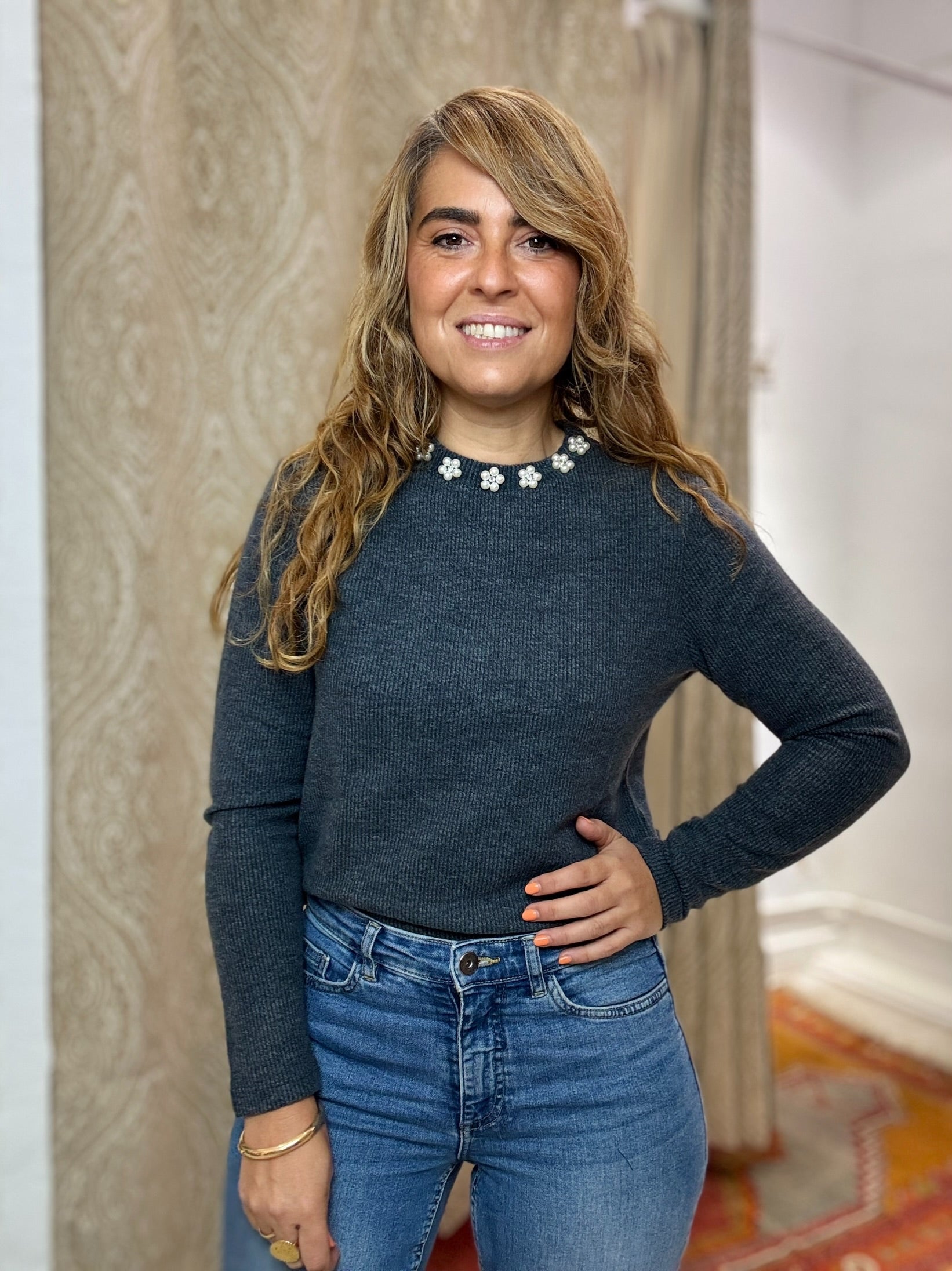 -Detalle del cuello tipo Mao con botón trasero y la parte delantera del mismo adornada con unas bonitas flores de perlas y brillante.
