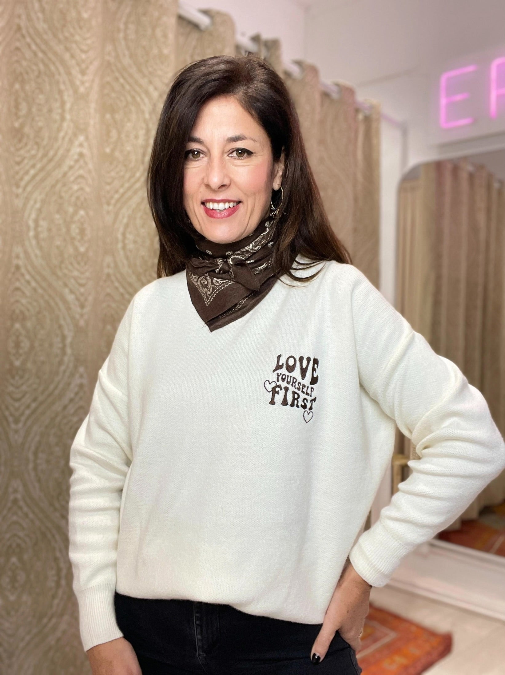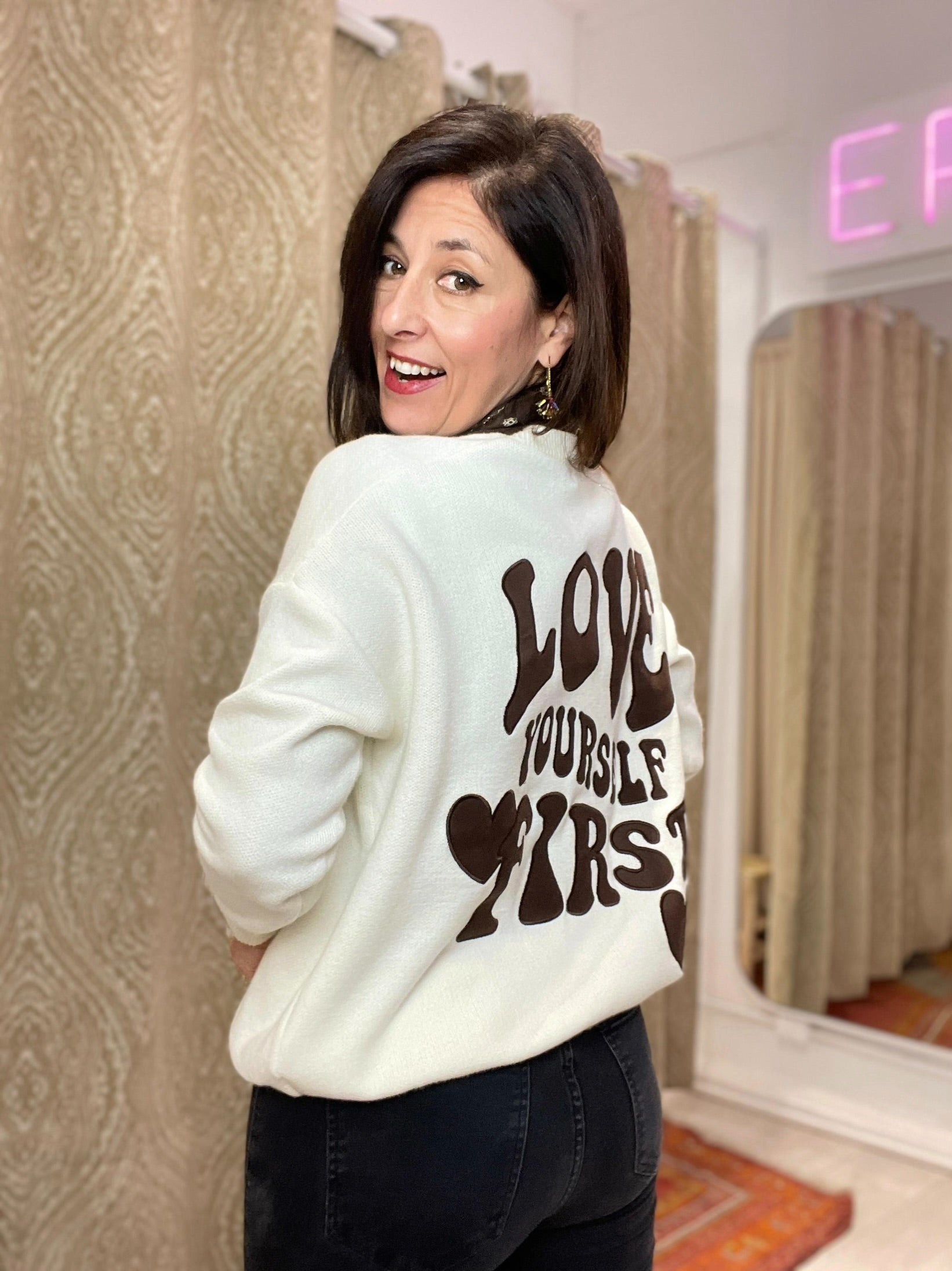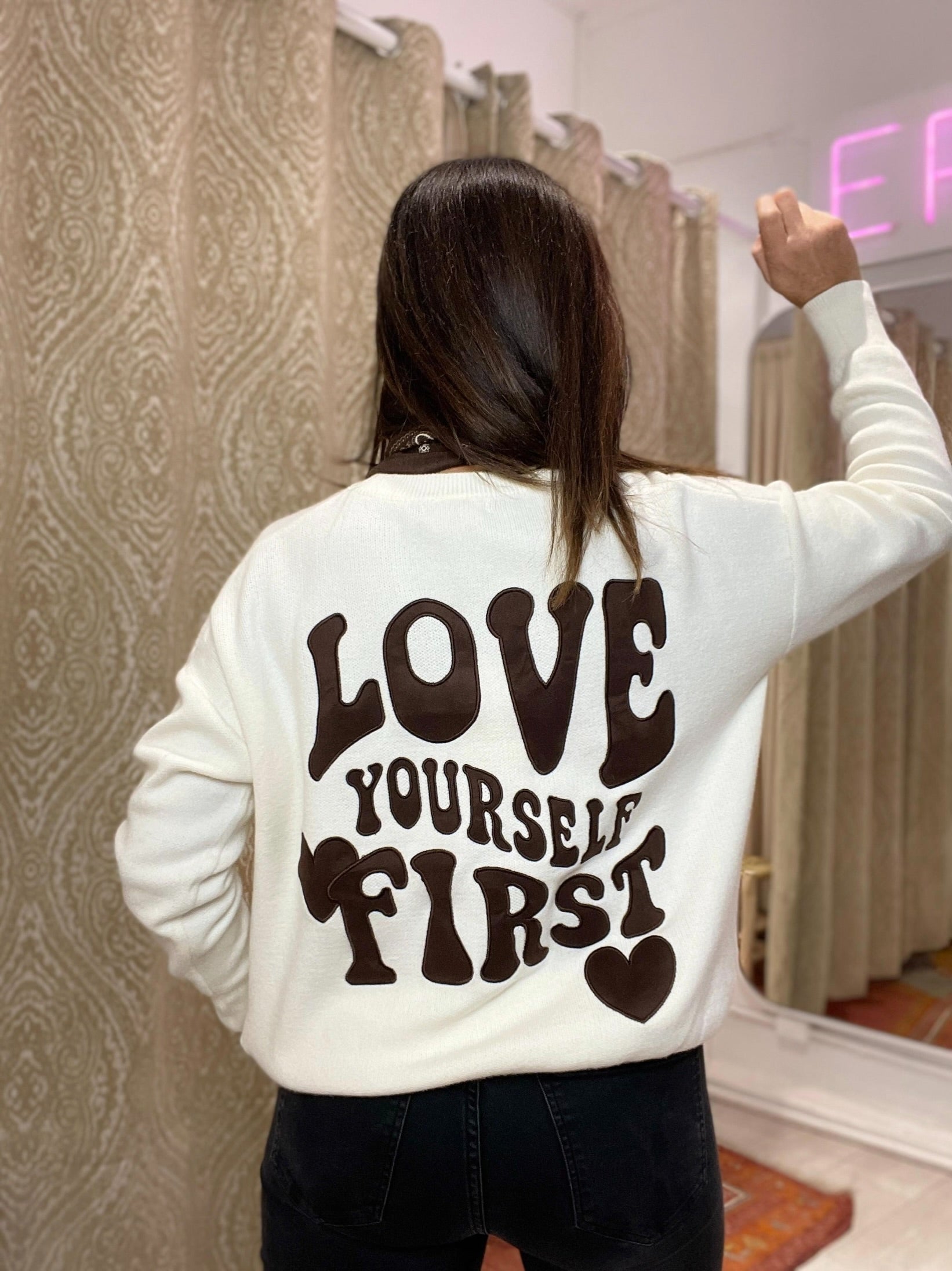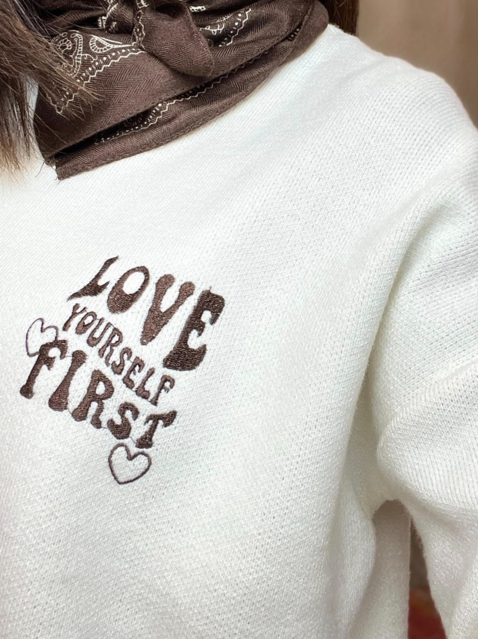 -Detalle de letras bordadas " LOVE YOUR SELF FIRST" en chocolate en la espalda en grande y en pequeñito en el delantero.