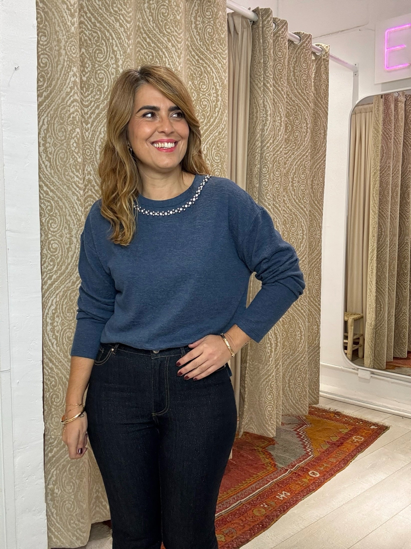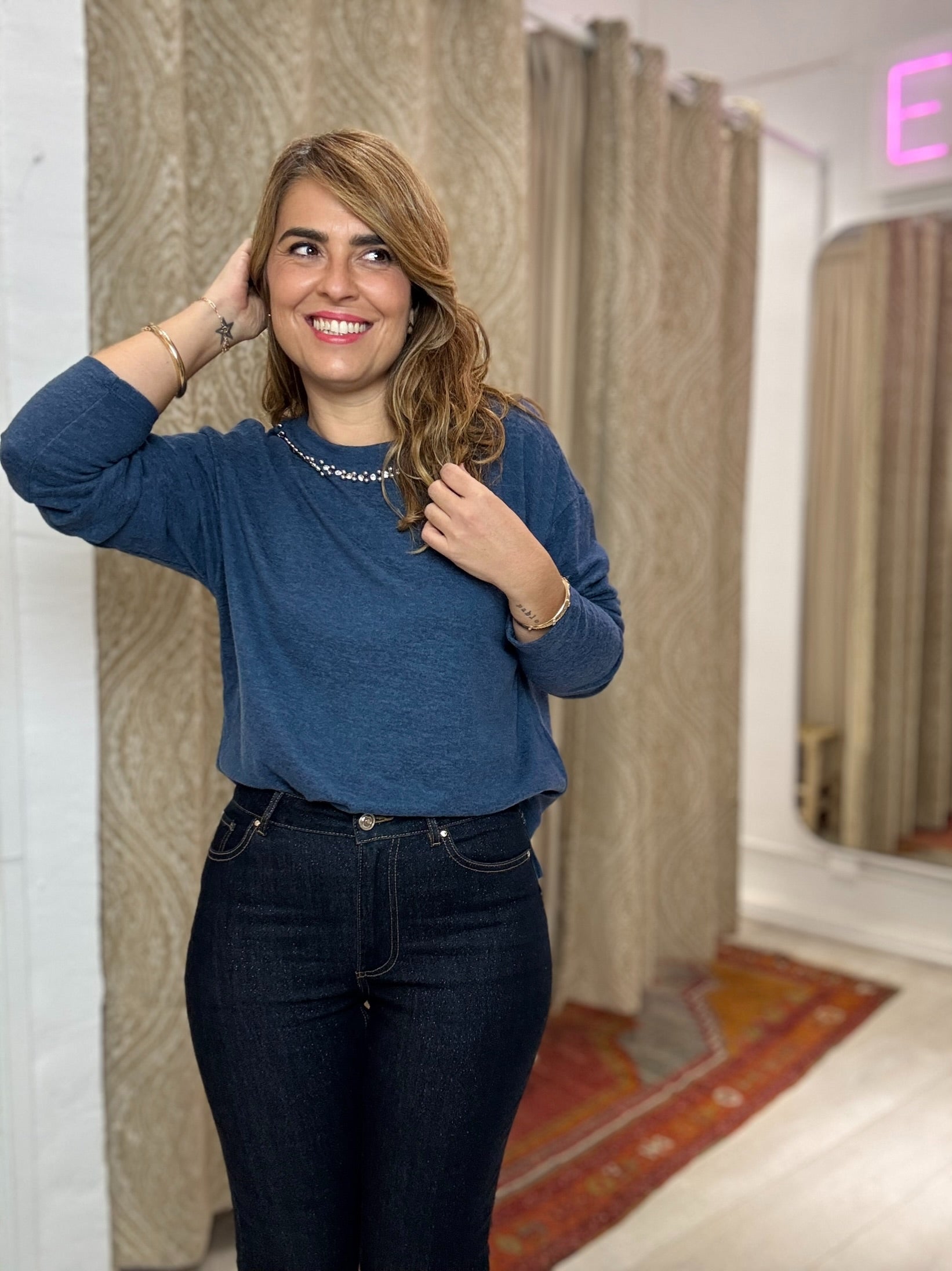 -Jersey recto muy finito, en un azul vaquero muy bonito, escote redondo y manga larga.