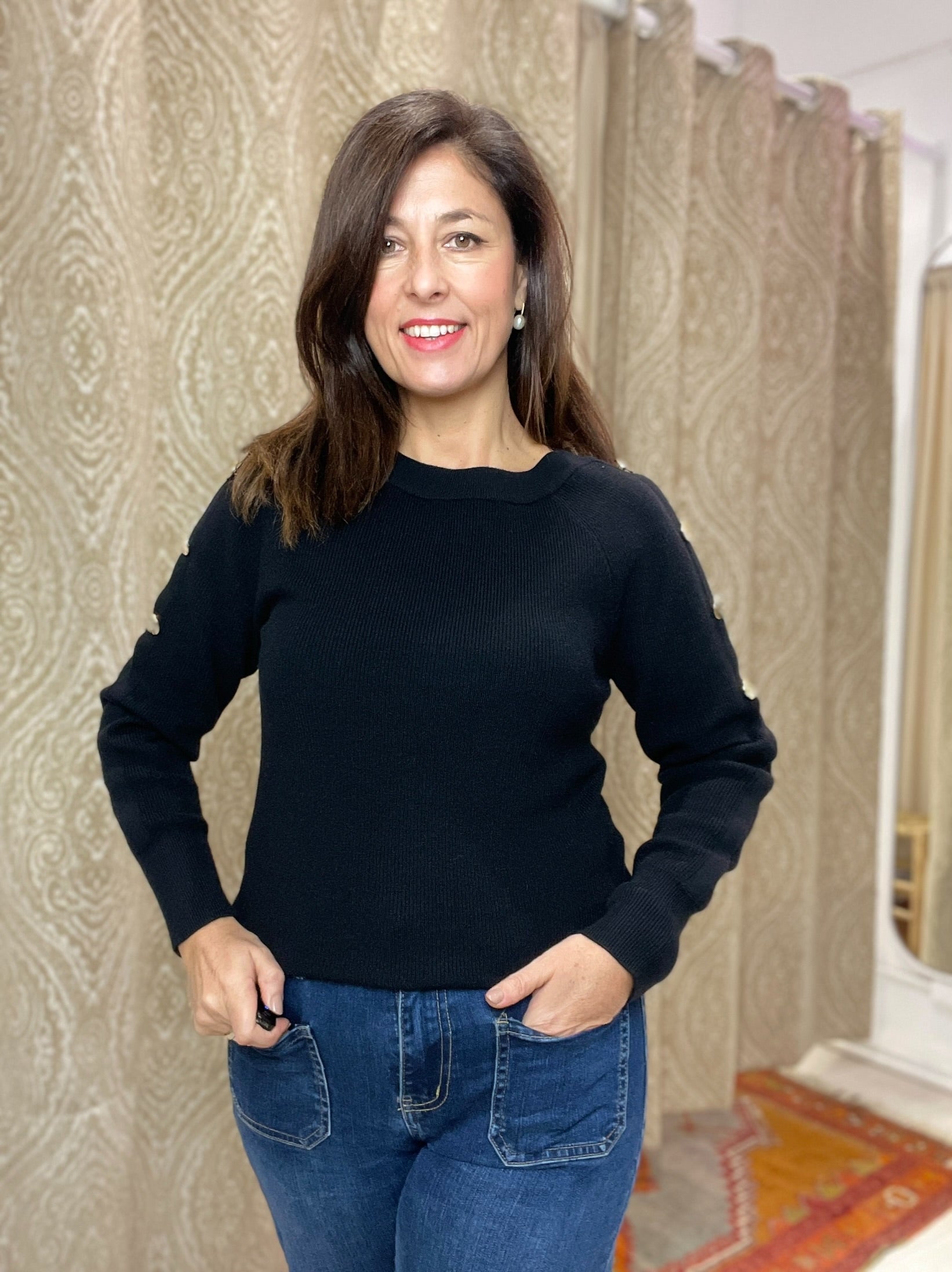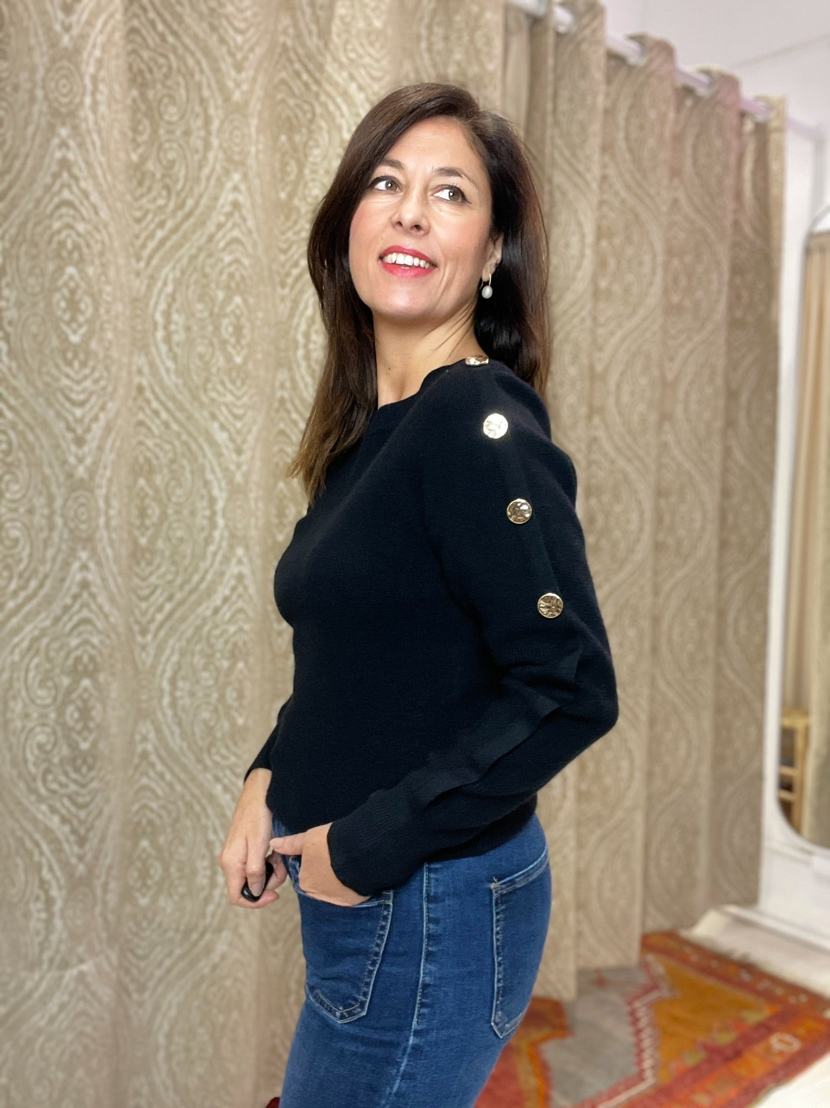 -Jersey en punto acanalado en color negro, con cuello redondo y manga larga.