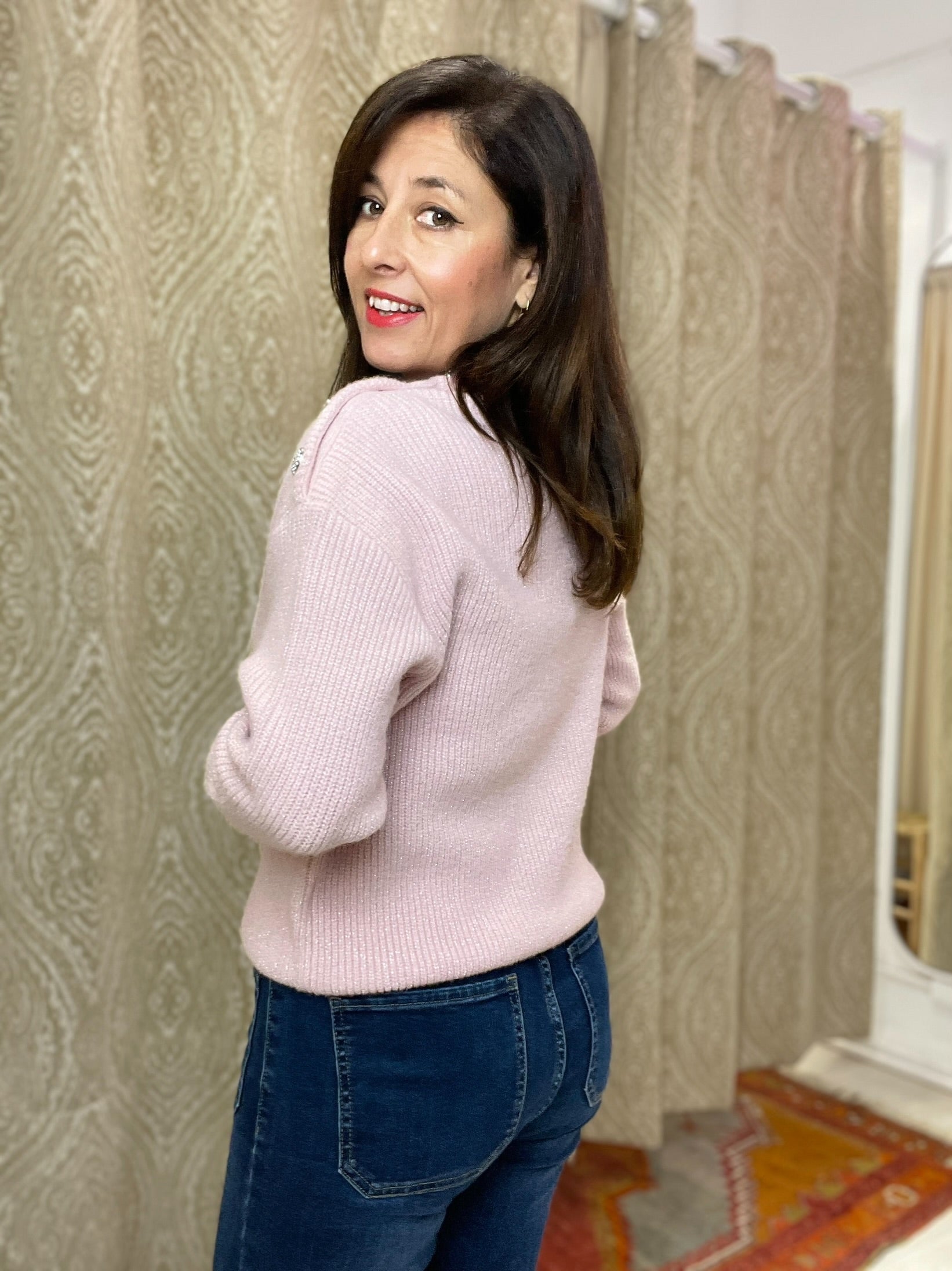 -Detalle del tejido con un brillo en el mismo tono y espectaculares botones desde el cuello hasta el hombro izquierdo, con forma de corazon y de brillantitos.