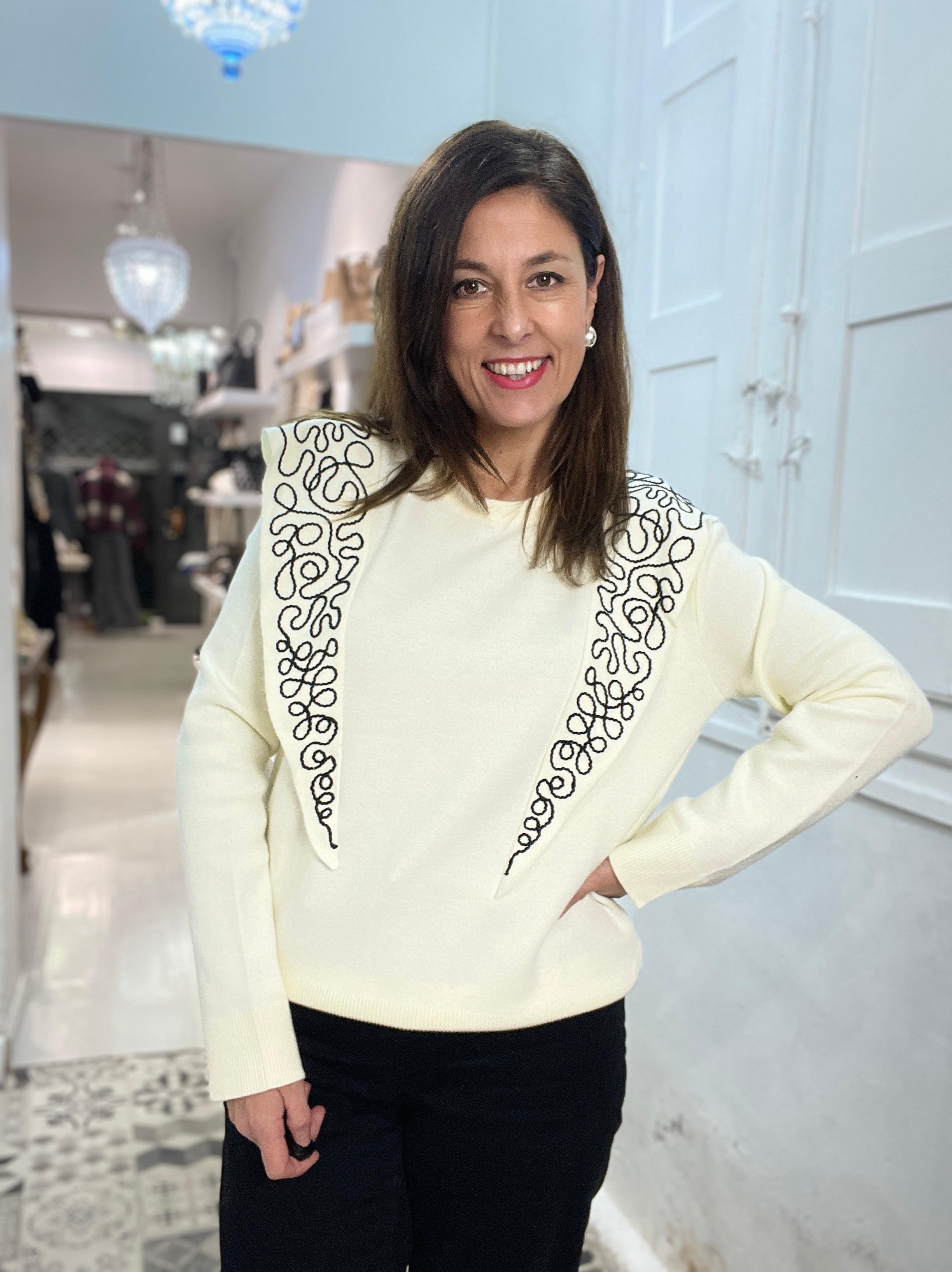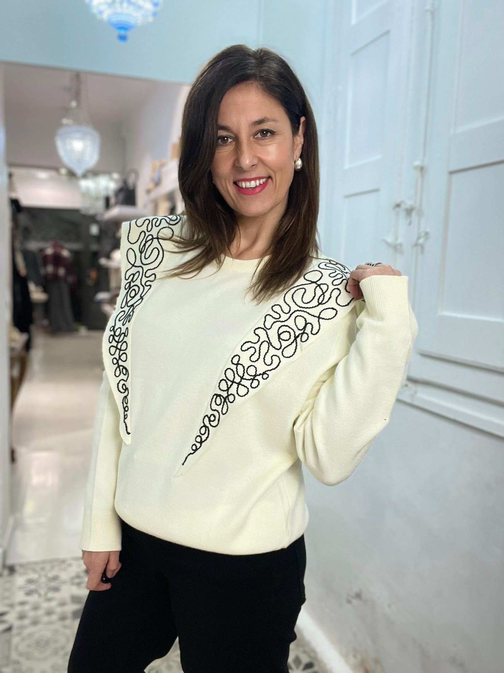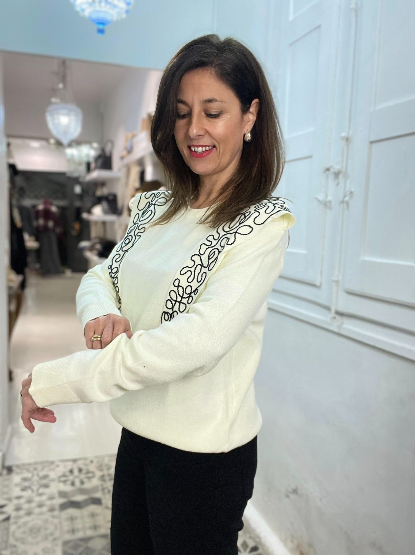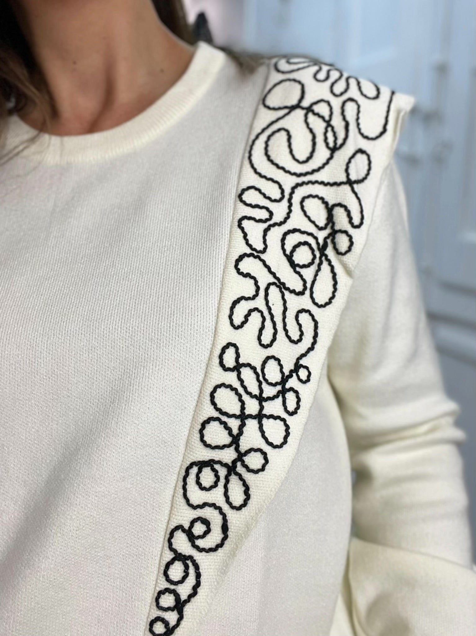 -Detalle de solapa que sale del hombro con un fino bordado en negro.