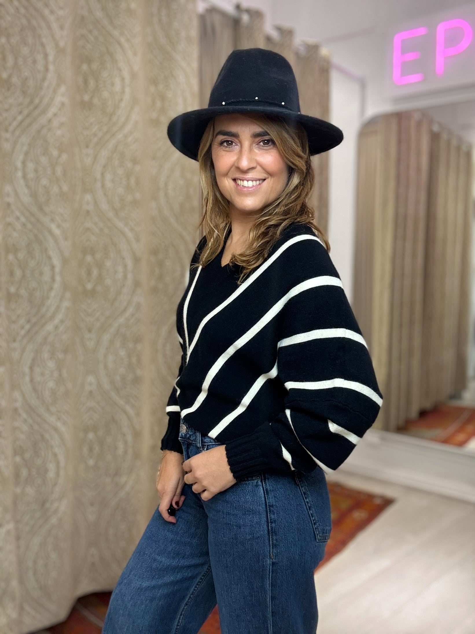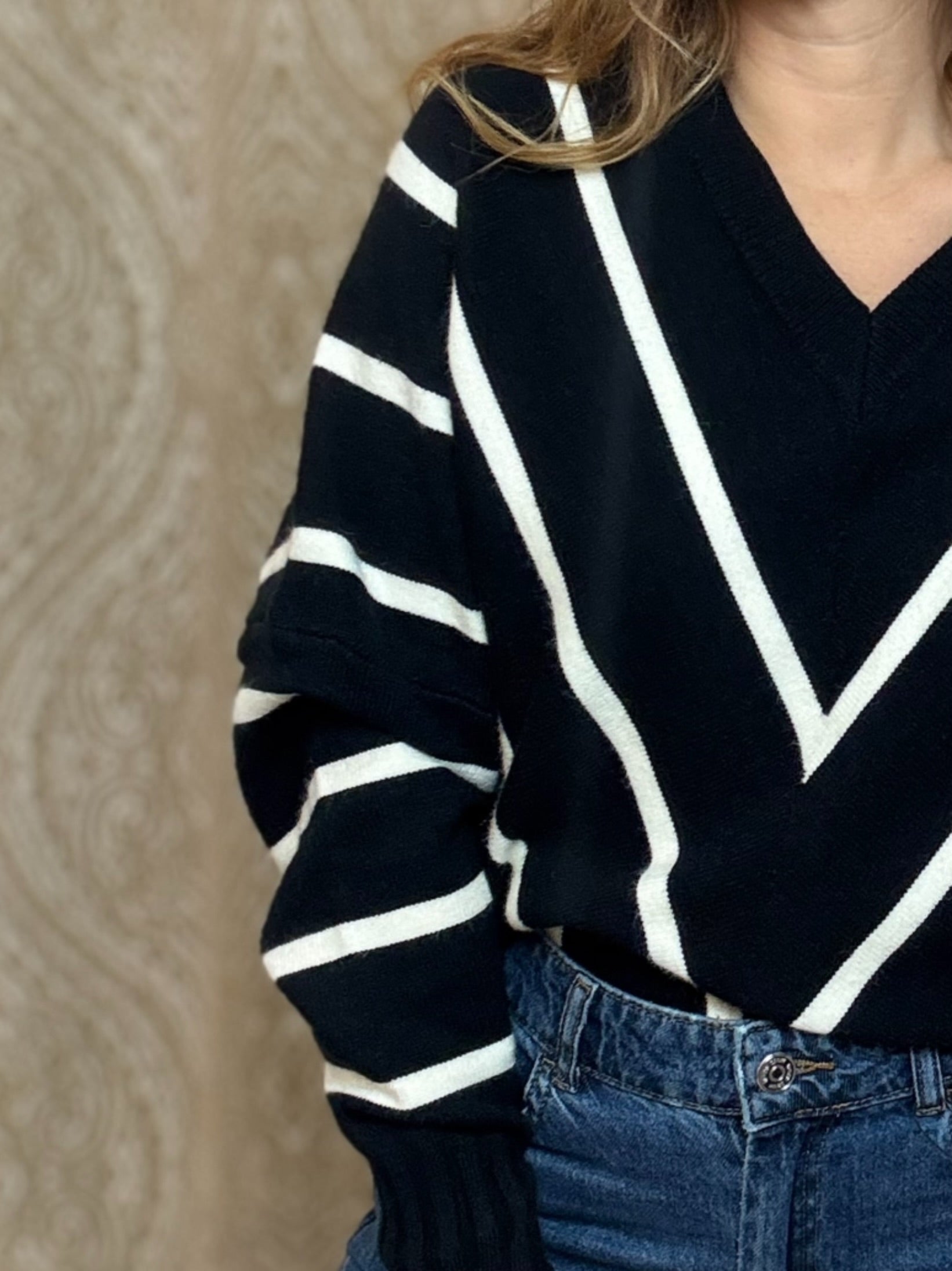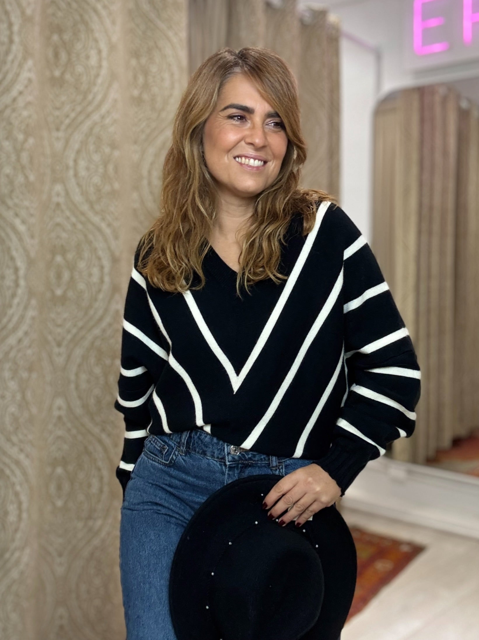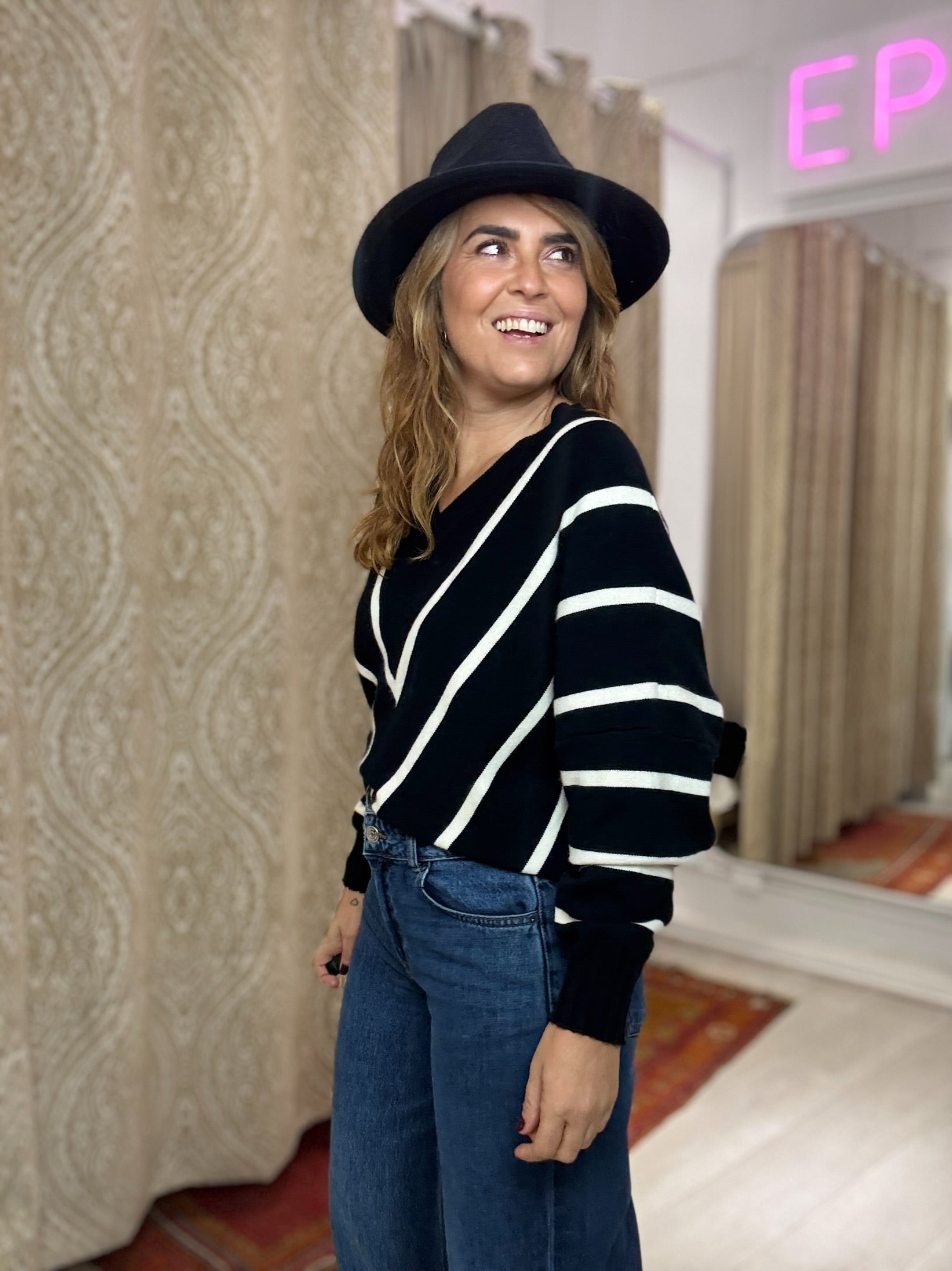 -Jersey negro en punto medio, escote en V y manga murciélago.