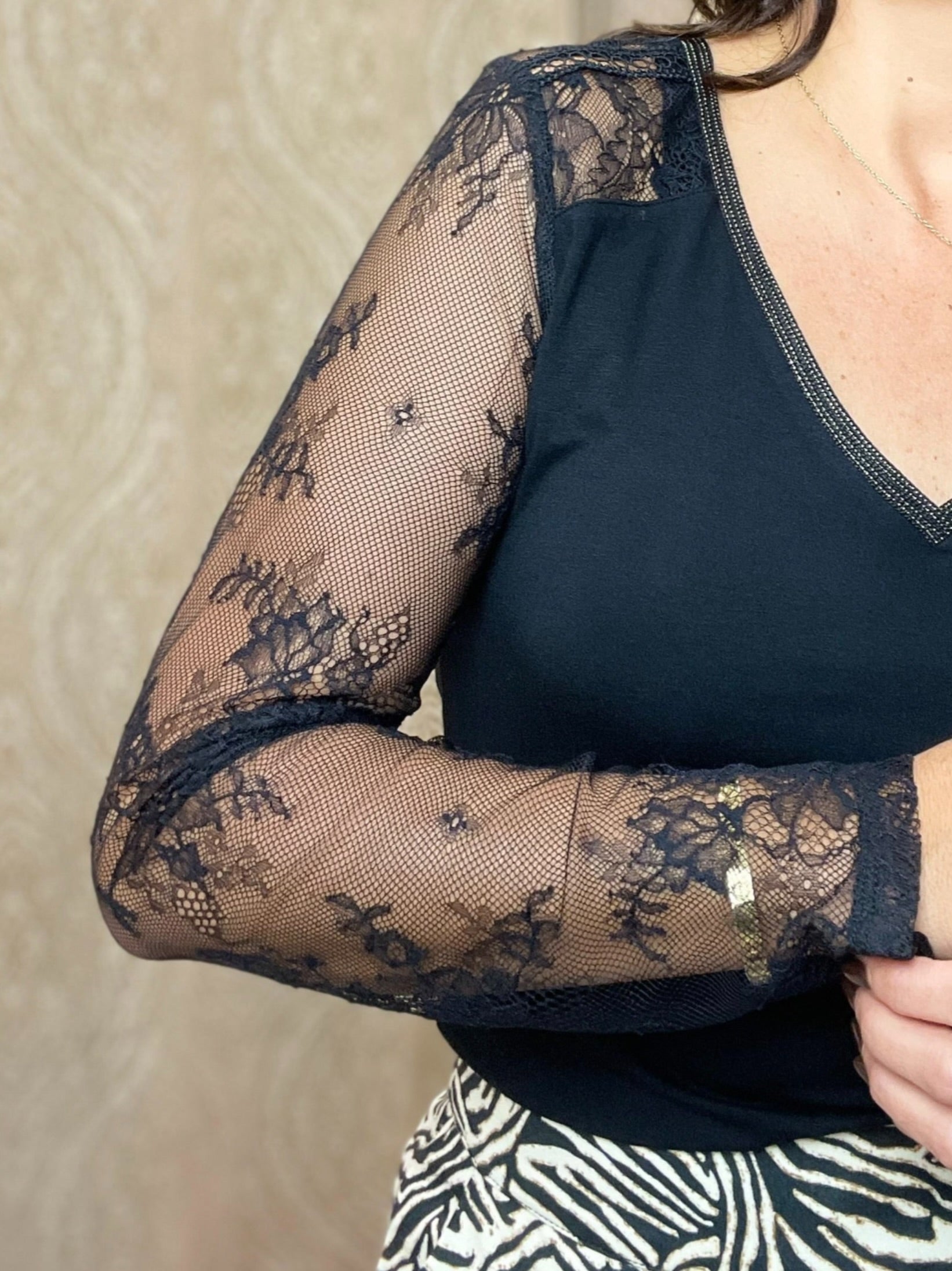 -Top lencero negro, escote en V y manga larga.