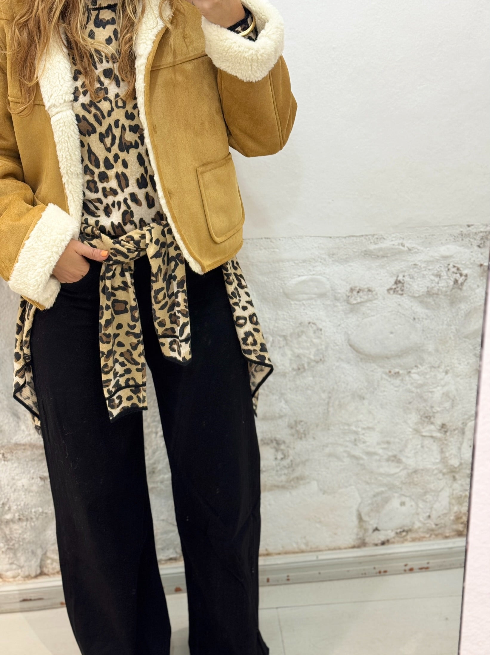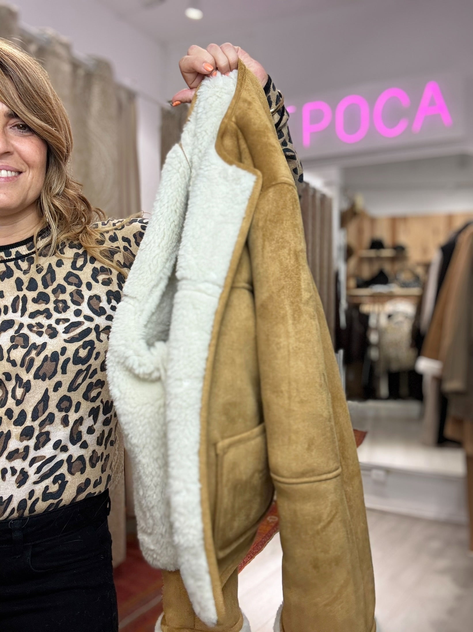 -Pelliza recta en serraje color camel con borreguito crema en el interior, cuello redondo y cierre de cremallera.