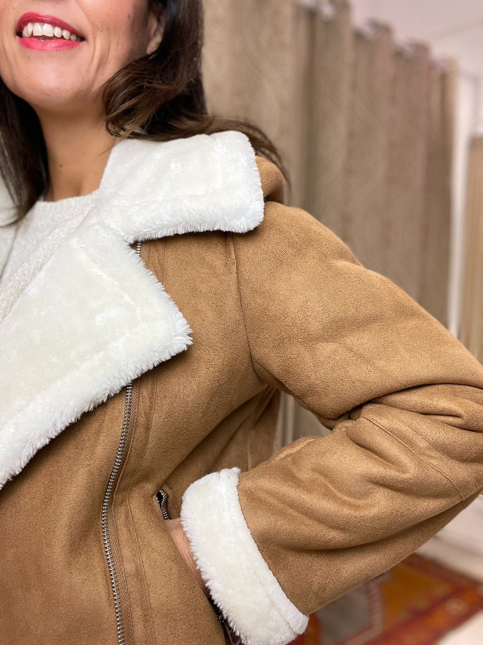 -Pelliza cruzada en serraje color camel oscuro con borreguito en el interior.