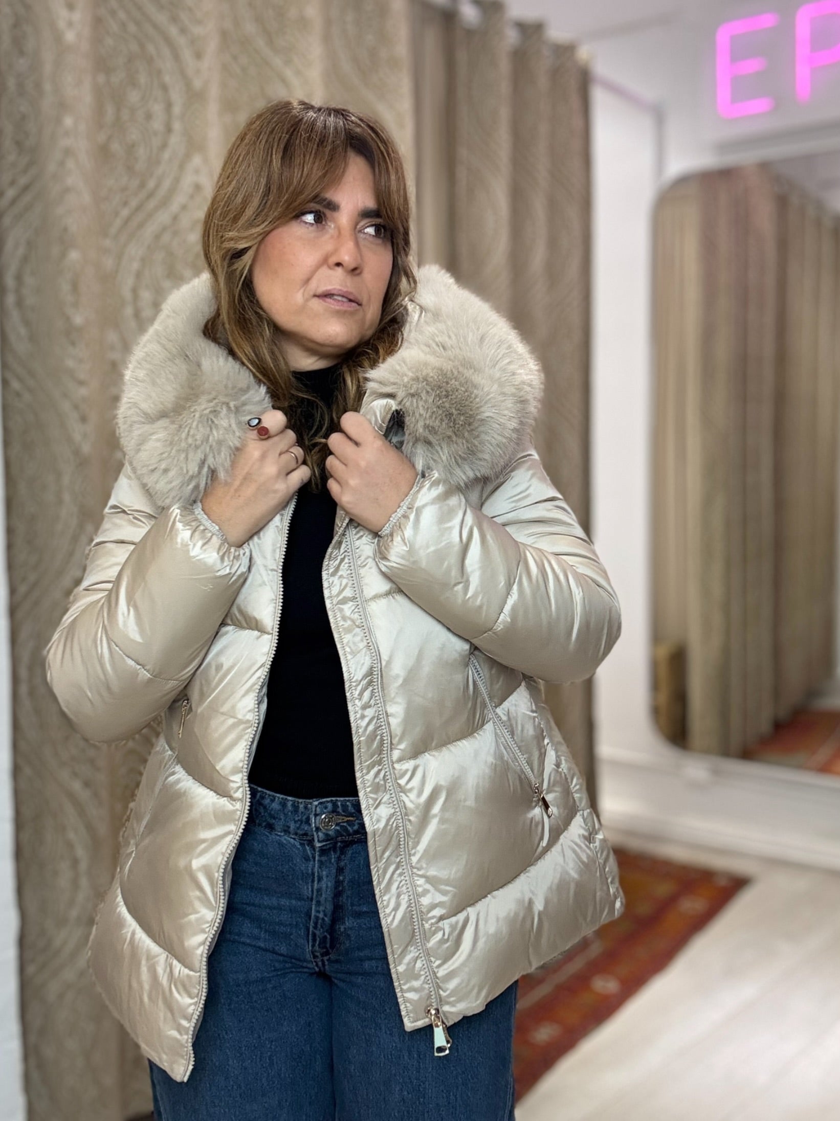 -Plumas beige con capucha con pelo desmontable y bolsillos laterales.