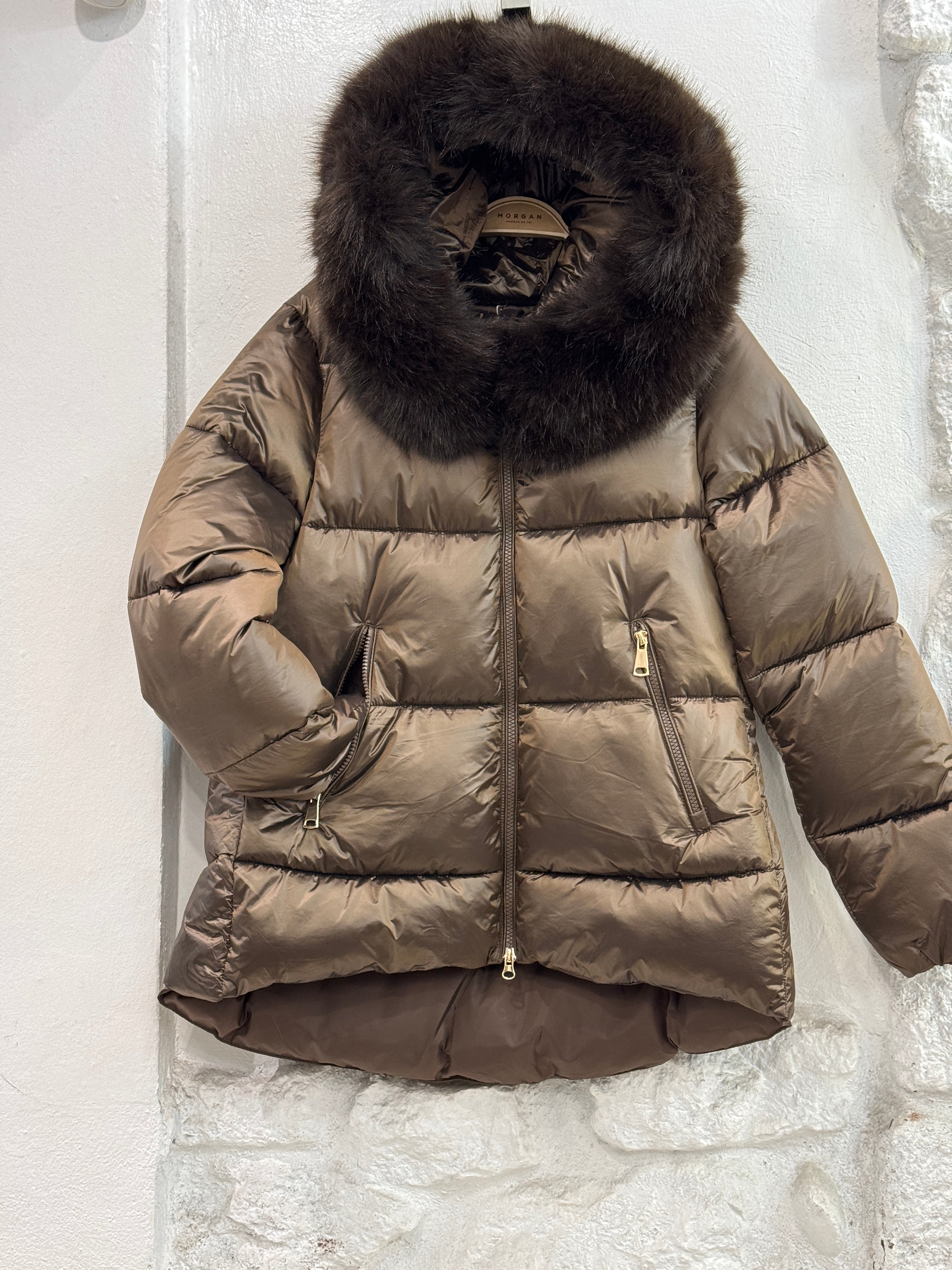 -Plumas marrón con capucha con pelo desmontable y bolsillos laterales.