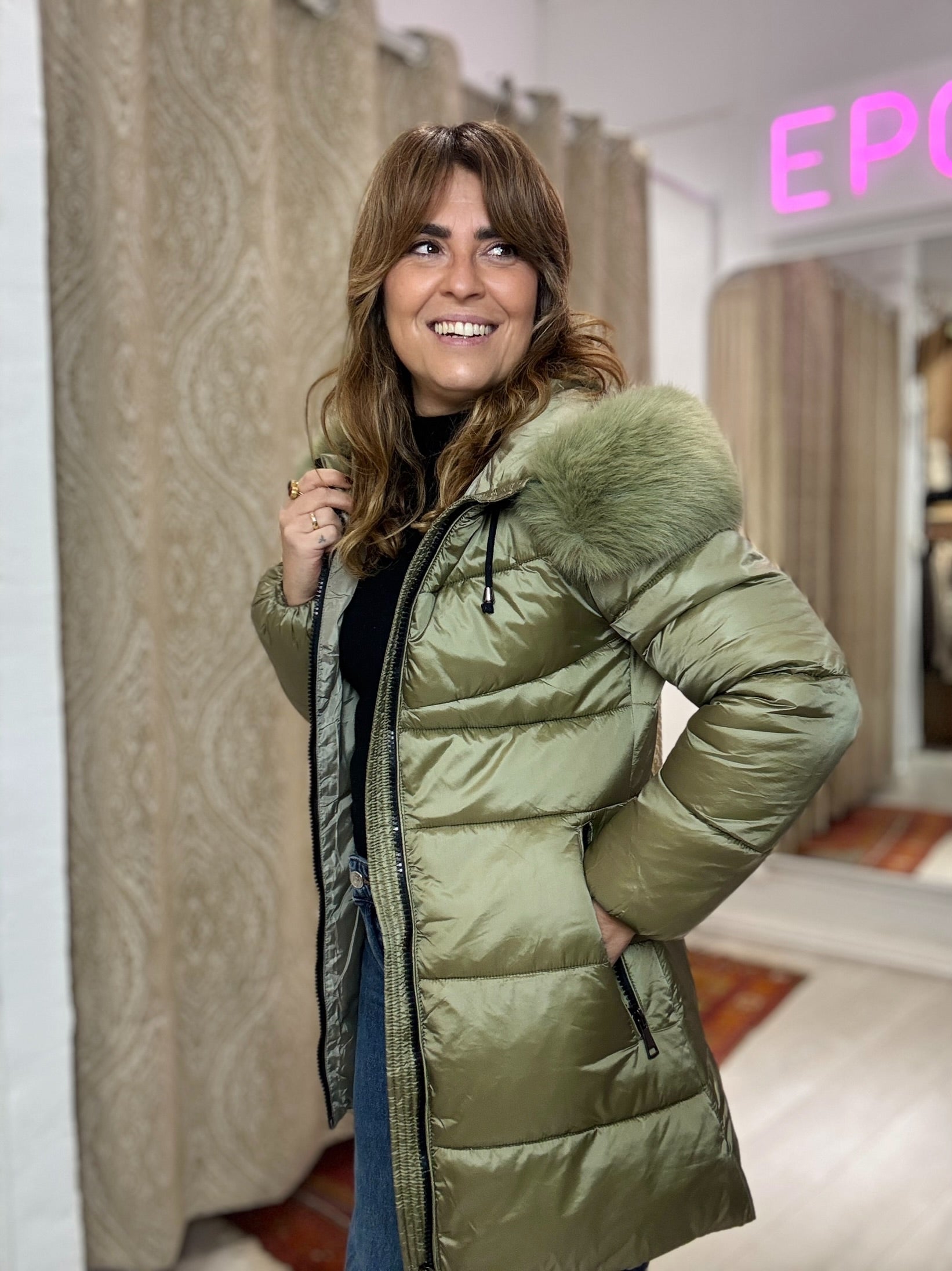 -Plumas verde con capucha con pelo desmontable y bolsillos laterales.