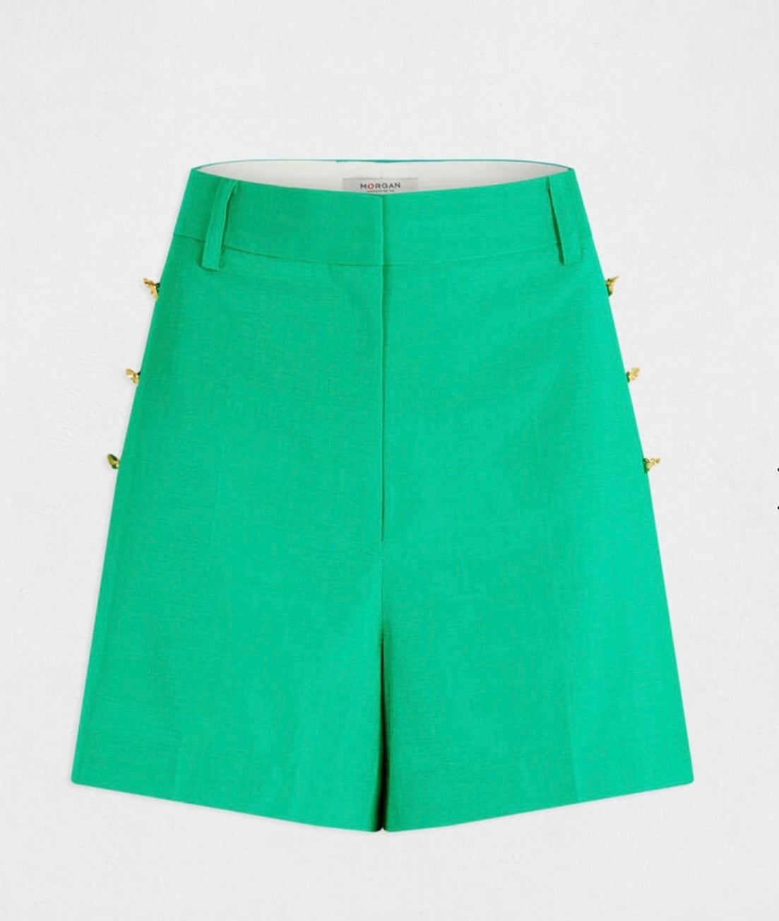 -Detalle del tejido en un bonito color verde vibrante y botones decorativos en dorado en la zona de los bolsillos.