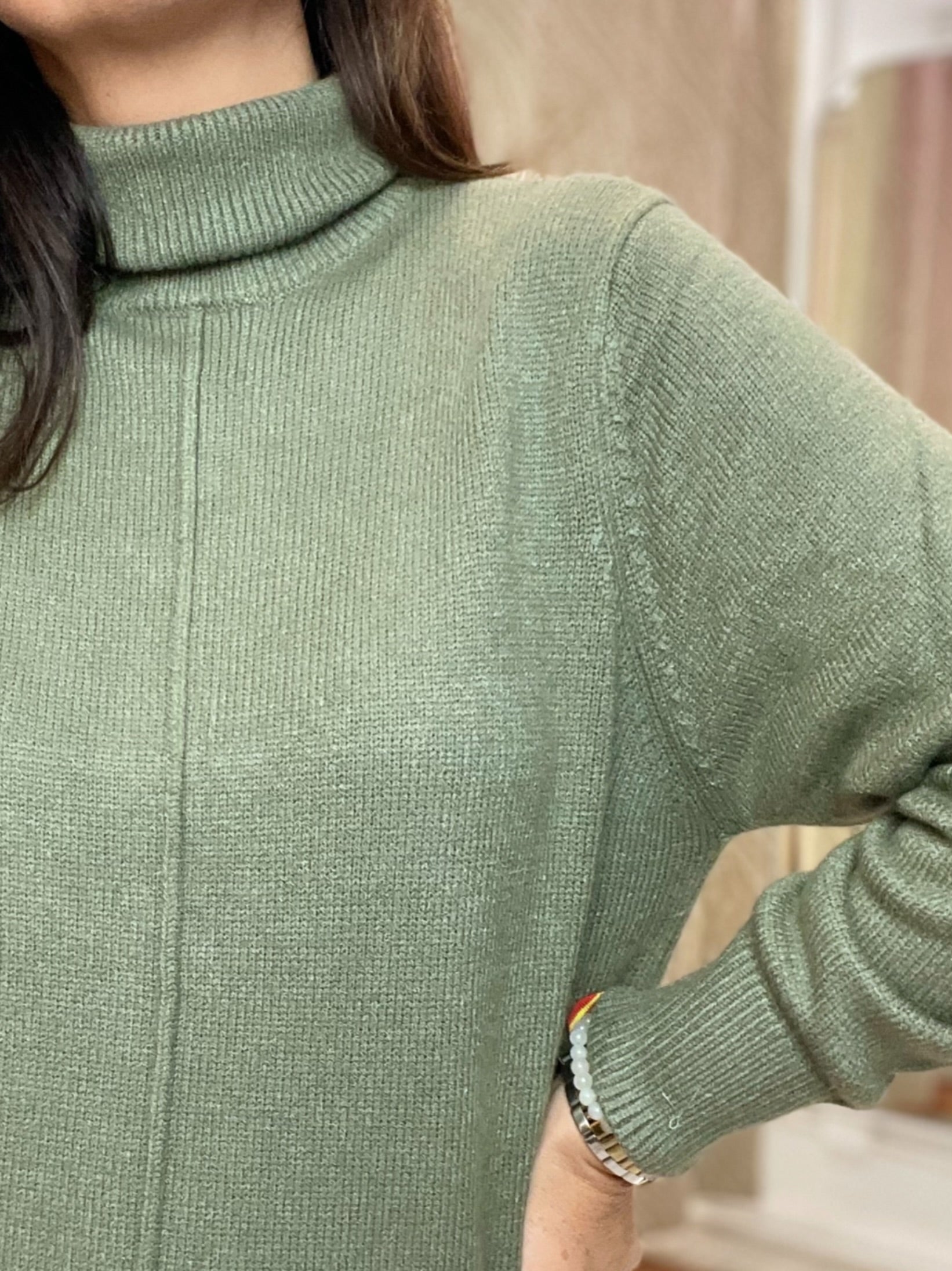 -Vestido corto en punto medio, cuello alto y manga larga.