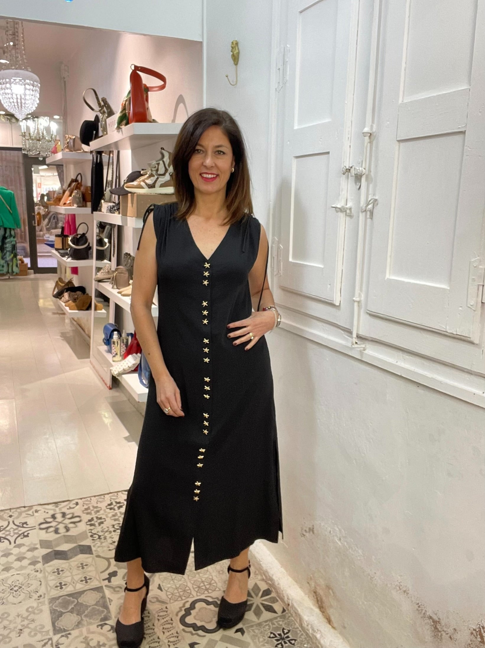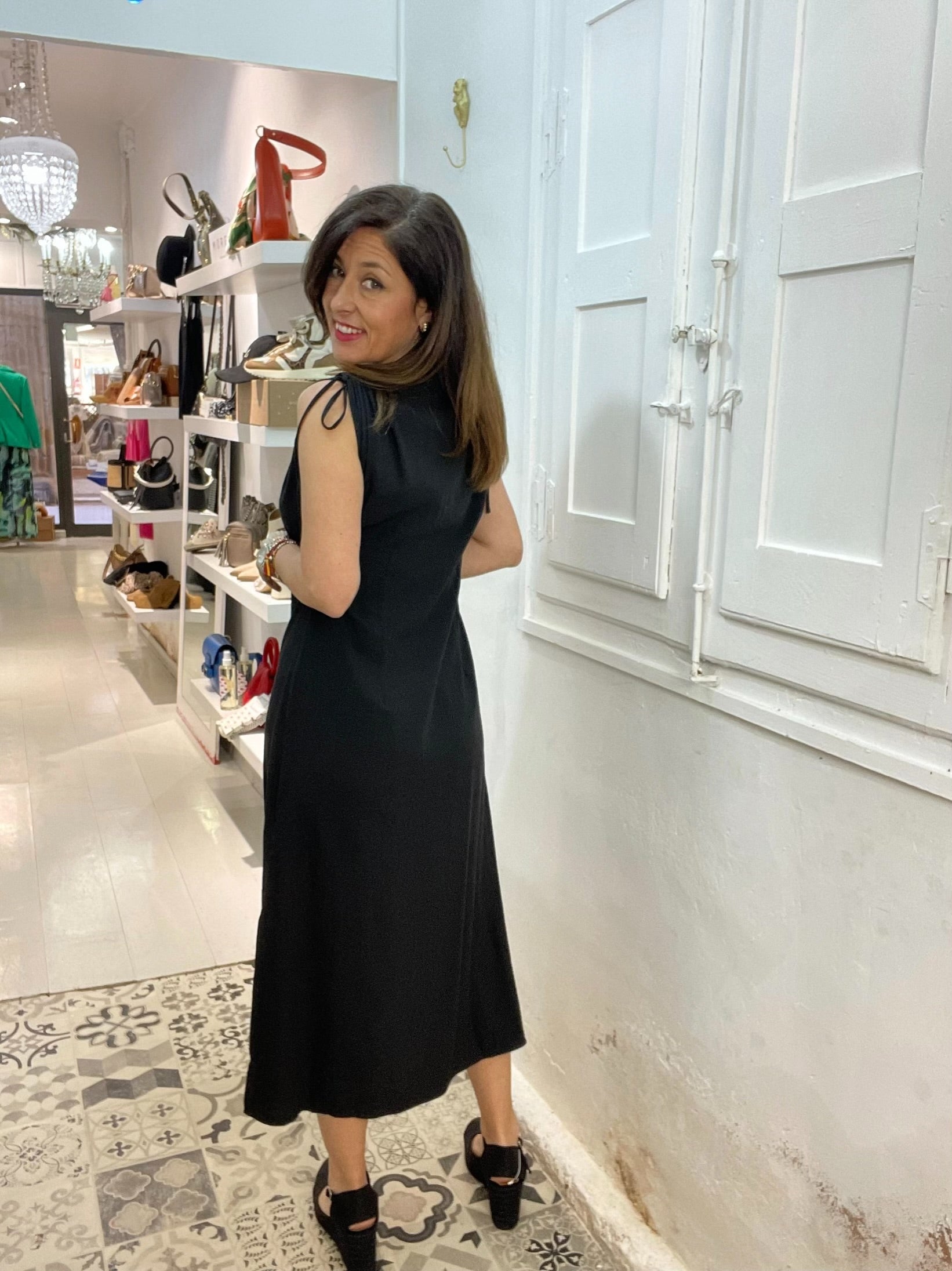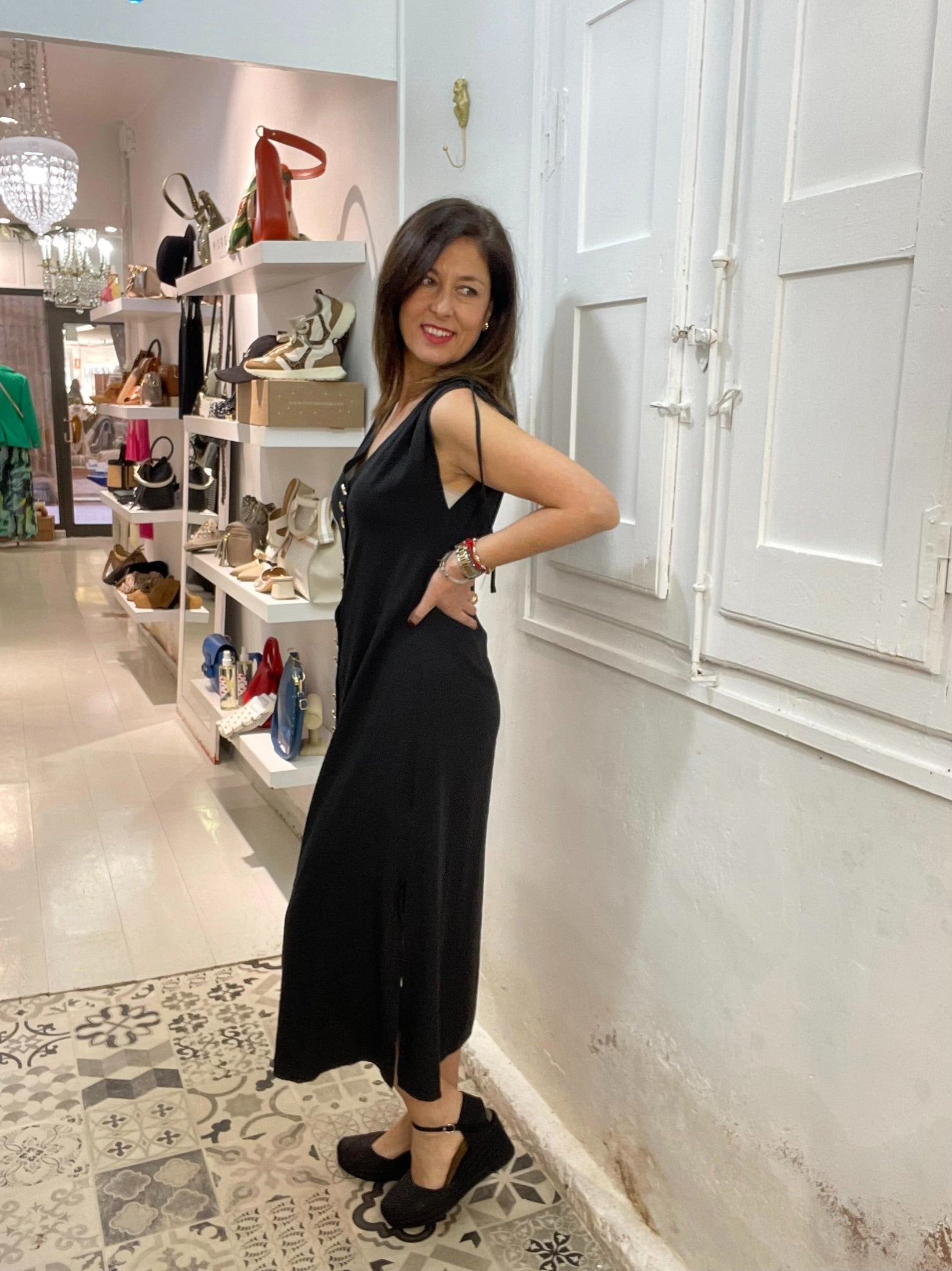 -Vestido largo en color negro, escote en pico y hombro fruncido creando una medio manga.