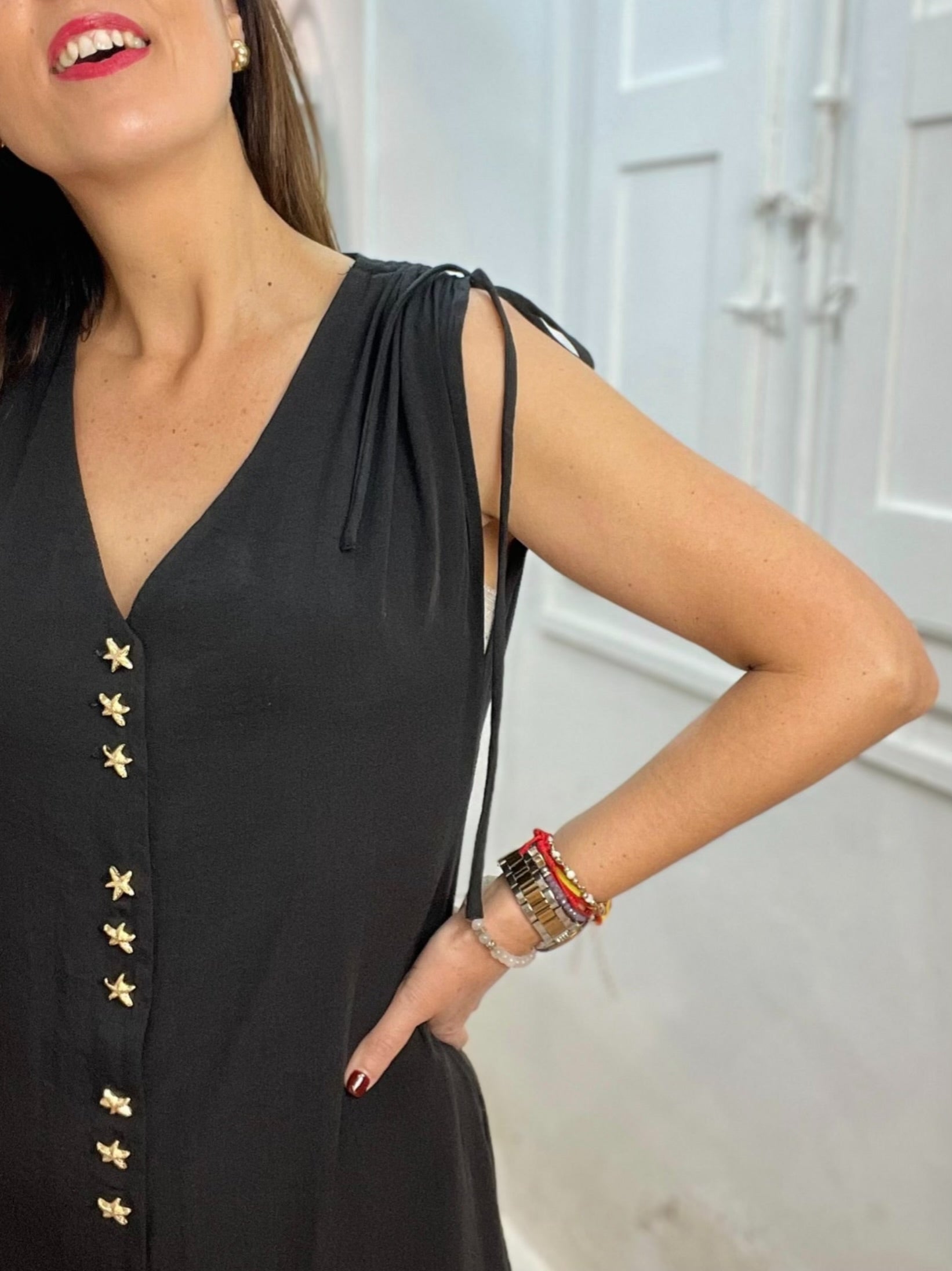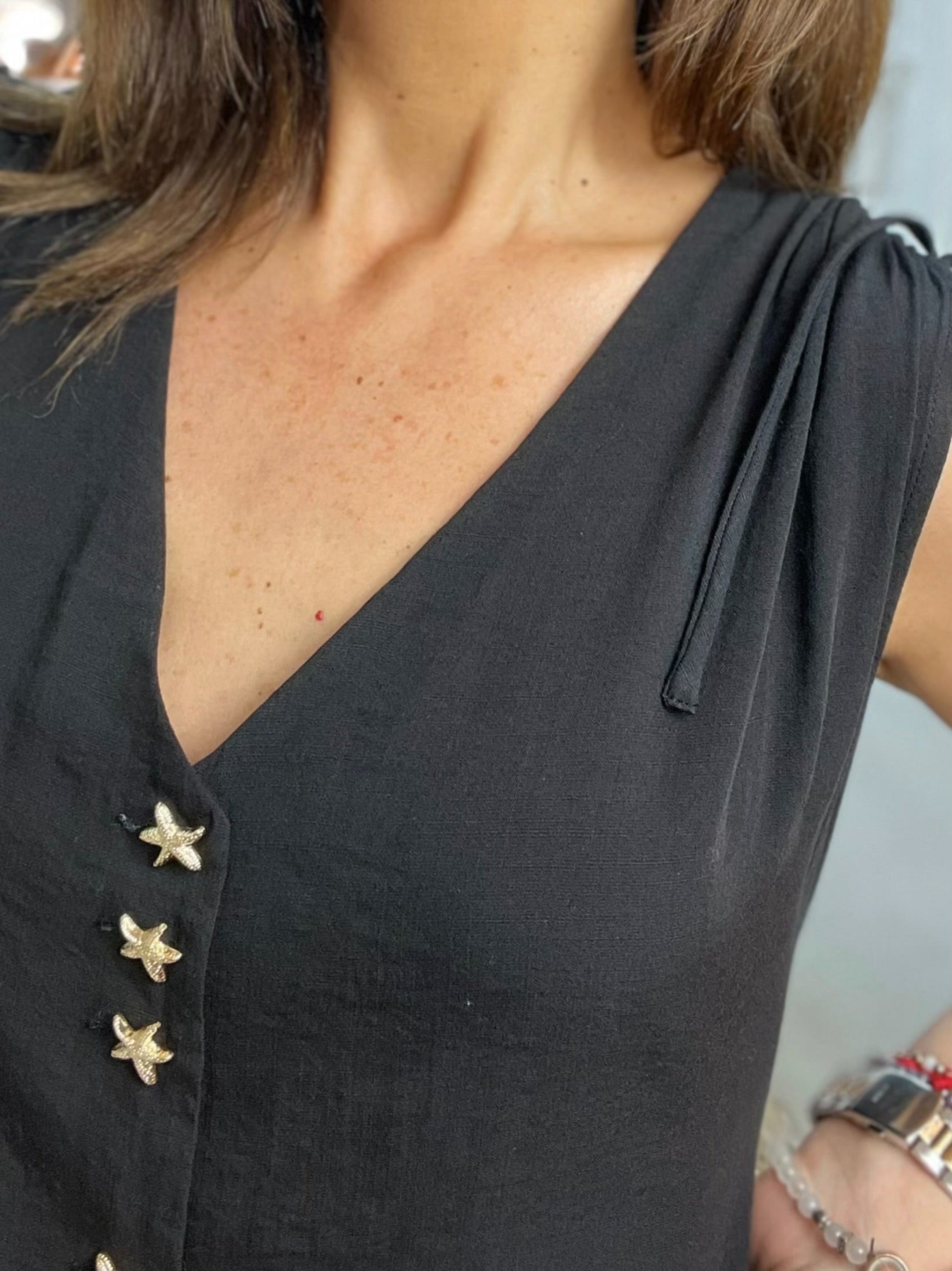 -Detalle de botones dorados en forma de estrella de mar a lo largo de todo el frente de la prenda.